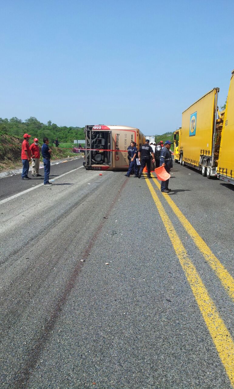 Ciudad Lázaro Cárdenas, Mich., Junio 25.- Un autobús de la empresas Primera Plus, con placas de circulación 073RR3 y número económico 3586 quedó volcado sobre la carpeta asfáltica de la autopista Siglo XXI, a la altura del kilómetro 273 en el tramo Feliciano-Infiernillo, situación que dejó una estudiante fallecida y 40 más lesionados, 8 de ellos de gravedad y el resto con raspaduras y fracturas de manos o pies.