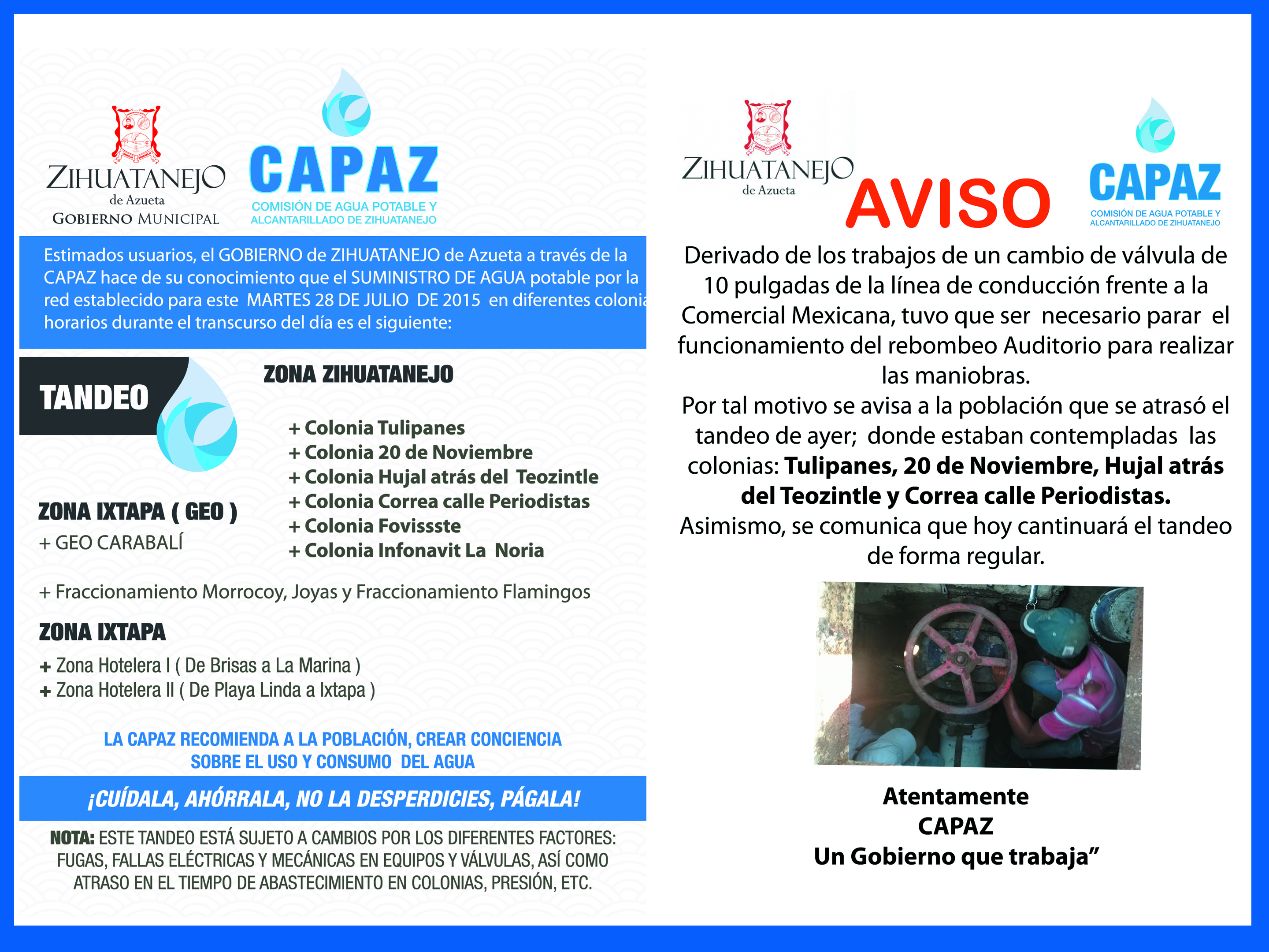 Tandeo y aviso de agua potable en Ixtapa y Zihuatanejo para este Martes 28