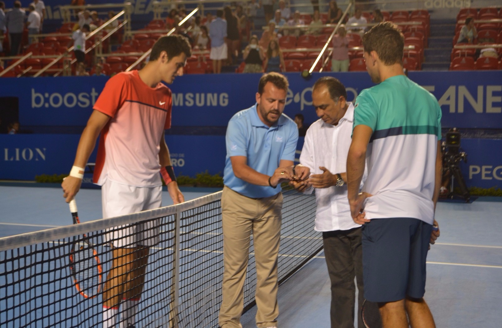 Acapulco, Guerrero, 27 de febrero de 2016.– Al asistir a la ceremonia de clausura del Abierto Mexicano de Tenis, el gobernador del estado, Héctor Astudillo Flores señaló que gracias a los esfuerzos conjuntos, este ha sido el mejor torneo en los últimos 23 años, lo que se constata por la gran asistencia de los aficionados, estadios llenos y la presencia de figuras de alto nivel. En conferencia de prensa en la que estuvo acompañado por el director general del Mextenis, Ernesto Raúl Zurutuza, el mandatario señaló que como resultado de este trabajo coordinado, el Abierto Mexicano de Tenis, se quedará de manera permanente en Acapulco y seguirá siendo una importante plataforma para los jugadores más destacados y para las nuevas estrellas. «Esta es una oportunidad para que el turismo vuelva a Guerrero, para que vuelva especialmente a Acapulco. Esta es una muestra de confianza en los tiempos difíciles, de los que estamos por supuesto saliendo», señaló. Expresó que parte de este éxito se logró gracias a que se dio certidumbre al empresario Alejandro Burillo, al Grupo Pegaso y a la sociedad a través del reforzamiento de las acciones de seguridad, entre otras. «Tenemos el compromiso de salir adelante en los próximos años y Héctor Astudillo está con toda la disposición para que este torneo continúe en Acapulco», añadió. También señaló que espera que esta tendencia positiva se siga dando ante el inicio de la próxima temporada vacacional de Semana Santa. En tanto que Raúl Zurutuza expresó su beneplácito por el éxito de esta edición, en donde la colaboración y disposición del gobierno estatal permitieron generar grandes resultados y a su vez, la permanencia en Acapulco. También estuvieron presentes el secretario de Fomento Turístico, Ernesto Rodríguez Escalona ; el representante del Grupo Pegaso, Javier Braun Murillo, entre otras personalidades.