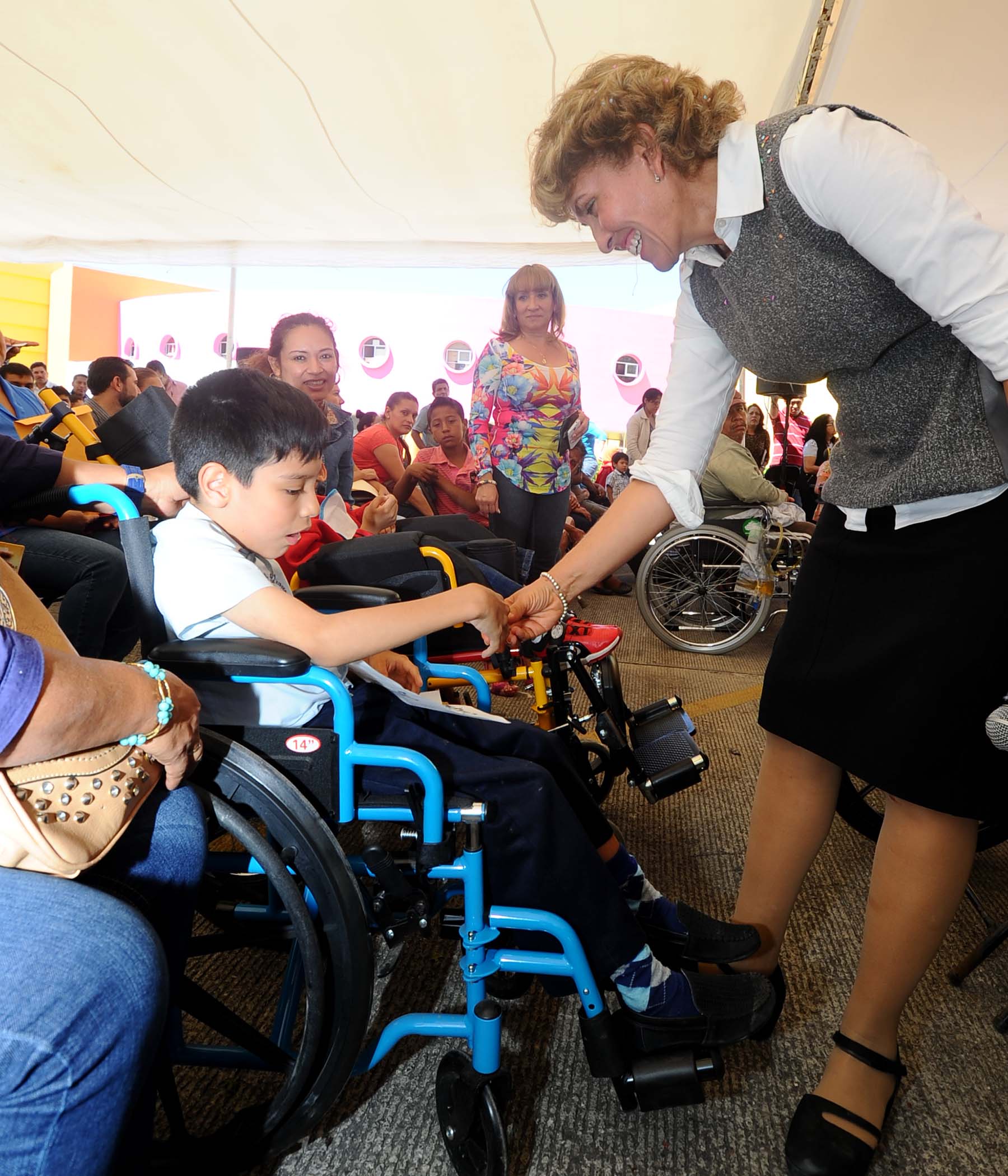 Chilpancingo, Gro., 21 de febrero de 2016.- Emocionado, con una sonrisa, el niño Javier Jesús Santos Catalán de 8 años de edad, recibió una silla de ruedas infantil de la presidenta del Patronato del Sistema DIF Guerrero, Mercedes Calvo de Astudillo, como parte de los apoyos que se otorgan a las personas con discapacidad. Acompañado de su abuela, la señora Isabel Martínez Salgado, ambos de la Colonia Bella Vista, de Chilpancingo, nos cuenta que es un niño inteligente y amistoso a pesar de su padecimiento, por haber nacido prematuro, pero gracias a las terapias físicas que ha recibido en el CRIG, ha logrado mejorar y con esta silla de ruedas podrá desplazarse más rápido de su casa al Centro de Atención Múltiple, donde cursa el tercer año de primaria.  En el evento realizado en la explanada del Centro de Rehabilitación Guerrero (CRIG), Mercedes Calvo entregó aparatos funcionales como sillas de ruedas, infantil y adultos, sillas especiales para parálisis Cerebral Infantil, andaderas, bastones y muletas, así como pares de zapatos ortopédicos a niños con pie plano del Cendi Comunidad Infantil. Además de tarjetas de despensa a personas con discapacidad.  En su mensaje, la señora Mercedes expresó su alegría de recibirlos y entregarles apoyos que van a mejorar su calidad de vida, “para nosotros es importante atender sus necesidades, porque el gobernador ayuda al DIF para que los beneficios lleguen a la gente que más lo requiere”. En su intervención, el director del DIF Guerrero, Francisco Solís Solís dijo que la  indicación del gobernador, Héctor Astudillo Flores y de la señora Mercedes Calvo es atender de manera inmediata a las personas con discapacidad y en los  primeros 100 días se han entregado más de 3 mil aparatos funcionales.