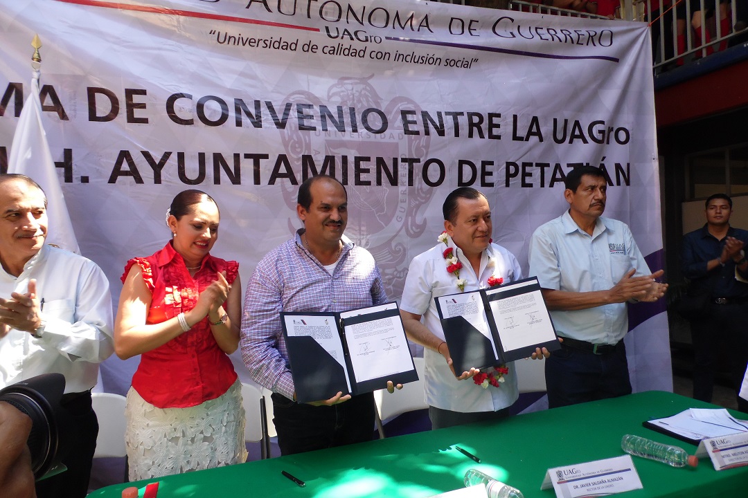 PETATLÁN, GRO.- Ayer se firmó un convenio de colaboración entre el gobierno municipal que encabeza el presidente Arturo Gómez Pérez y el rector de la Universidad Autónoma de Guerrero (UAGro) en el cual se contempla que estudiantes egresados de esa máxima casa de estudios realicen el servicio social en diferentes direcciones importantes del gobierno municipal y así coadyuvar a ofrecer un mejor servicio púbico al municipio de Petatlán. La ceremonia de la firma del convenio se llevó a cabo a la 13:30 horas posterior a la inauguración de la fachada del edificio principal de las instalaciones de la preparatoria número 25, luego de un breve retraso en la gira del rector Javier Saldaña ya que tuvo que hacer una escala en la ciudad de Tecpan donde tuvo que hacer otras actividades en el plantel de ese municipio. Luego de la firma el alcalde Arturo Gómez destacó la gran disposición del rector Javier Saldaña, ya que una vez que el presidente Gómez Pérez dialogó con Javier Saldaña hace unos meses en la ciudad de México en la cámara de diputados sobre la intención de colaboración con servicio social de psicólogos en la unidad de rehabilitación, el rector le propuso también que en otras áreas como la jurídica y la médica lo podía apoyar así como de otros estudios, y que esa realidad hoy se estaba dando bajo la firma del convenio realizado ayer en las instalaciones de la preparatoria 25 con sede en Petatlán. En su intervención el rector Javier Saldaña destacó la importancia de la Unidad Académica o preparatoria 25 de Petatlán, donde los estudiantes egresados de esta escuela son los mejores hablando académicamente y nuestra universidad es la que tiene más estudiantes en el extranjero y somos la tercera universidad haciendo movilidad en todo el país y en otros países, en Cuba, Chile, Brasil y Argentina, España Estado Unidos y Canadá. Y así como nos vimos con el presiente Arturo Gómez que nos reunimos en el Congreso de la Unión haciendo Gestión buscando recursos él para su municipio y yo para los estudiantes, así se logran muchas cosas y por ello estoy en la mejor disposición de colaborar con el gobierno municipal de Petatlán. Posteriormente el rector Saldaña invitó al presidente Arturo Gómez para inaugurar un edificio de dos niveles donde se ubica un gimnasio con estacionamiento y de ahí el rector se trasladó a un balneario donde los estudiantes le ofrecieron una comida.