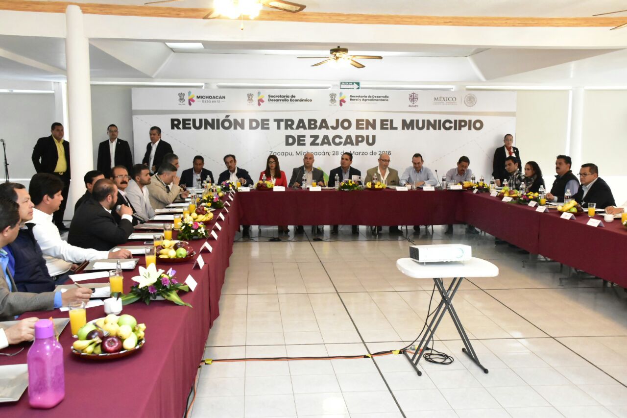 Zacapu, Michoacán, a 28 de marzo de 2016.- El Gobernador Constitucional, Silvano Aureoles Conejo, sostuvo una reunión de trabajo con representantes del sector empresarial y agropecuario de Zacapu, con quienes compartió que en Michoacán se está recuperando la confianza en el turismo, y las estadísticas lo ubican como una entidad con mayores niveles de seguridad, lo que ayudará a la estabilidad del estado y a generar inversión y empleo. En este encuentro, el mandatario escuchó las principales necesidades de ambos sectores, así como diversos proyectos para potencializar el desarrollo de dicho municipio, en este sentido, dio instrucciones a los funcionarios estatales presentes, para que se de seguimiento puntual a los puntos expuestos, con el fin de concretar los que sean viables. Durante la reunión a la que también asistieron integrantes del Gabinete del sector económico, ambiental y del campo, así como sus similares del ámbito federal, Silvano Aureoles destacó la sinergia entre los tres niveles de gobierno para generar acciones en beneficio de esta región del estado. Tras escuchar los proyectos planteados tales como parques industriales y ecoturísticos, de infraestructura carretera, y de turismo con el objetivo de aprovechar la riqueza arqueológica con que cuenta esta demarcación. El mandatario invitó a los empresarios a elaborar una propuesta para la reactivación del parque agroindustrial, mediante la cual, se trabaje en un esquema conjunto entre la iniciativa privada y autoridades gubernamentales. En tanto, en el tema del gasoducto que fue una de las propuestas de los sectores, señaló la necesidad de que se genere el estudio correspondiente como punto de partida y en materia de infraestructura carretera manifestó el interés de revisar los proyectos presentados. Aureoles Conejo reconoció el potencial turístico de esta zona, y la experiencia del sector empresarial, a quienes conminó a denunciar cualquier actividad que atente contra su seguridad. En tanto, anunció que se reforzarán las medidas en materia ambiental en la entidad, a través de la Fiscalía Especial para Delitos Ambientales y de la división de la Policía Forestal, así como del impuesto ambiental por el cambio de uso de suelo. Finalmente, el Gobernador compartió con las y los asistentes que durante los días de Semana Santa, Morelia recibió un total de 400 mil visitantes, lo que precisó, refleja que se está recuperando la confianza del turismo, al señalar que se va dejando atrás la imagen negativa que tenía Michoacán. Gerardo Torres Ochoa, alcalde de Zacapu, agradeció la visita del mandatario estatal, para escuchar los proyectos presentados por los diversos sectores de su municipio. En la reunión también estuvieron presente, los secretarios de Desarrollo Económico, Desarrollo Rural y Agroalimentario y de Medio Ambiente, Recursos Naturales y Cambio Climático, Antonio Soto Sánchez, Israel Tentory García y Ricardo Luna García respectivamente; los delegados de las Secretarías de Gobernación, de la Sagarpa, de la Semarnat y de Economía, Florentino Coalla Pulido, Jaime Rodríguez López, Mauro Ballesteros y Salvador Abud Mirabent respectivamente, así como el secretario Particular del Gobernador, Marco Aurelio Nava Cervantes y la procuradora Federal del Medio Ambiente, Talia Coria, por mencionar algunos.