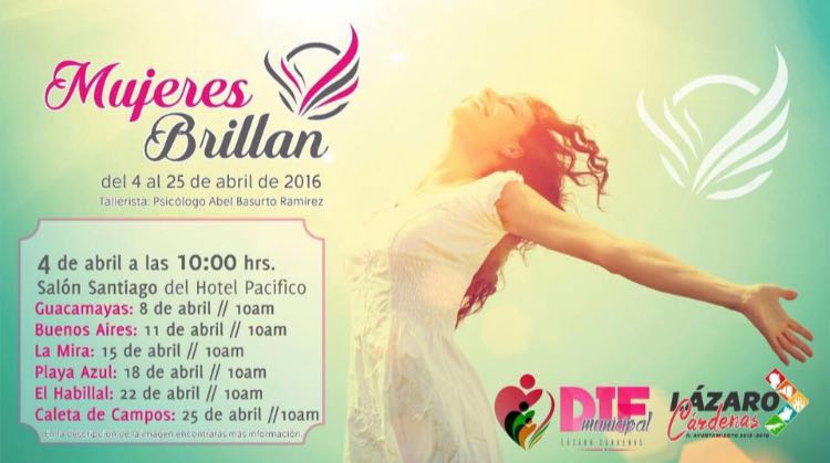 LÁZARO CÁRDENAS, MICH., 3 DE ABRIL 2016.- En apoyo a las mujeres de todo el municipio el DIF está ofreciendo conferencias y talleres denominados “Mujeres que Brillan” que a partir de este lunes y hasta el 25 de abril se estarán impartiendo en la cabecera municipal y las seis tenencias del municipio. “Estaremos buscando despertar la confianza en sí mismas de todas las amas de casa y de las mujeres jóvenes porque cada una lleva en su interior muchas cosas y sentimientos que le impiden su total desarrollo tanto en su trabajo, en su familia y consigo misma y para ello estos talleres”, explicó la Maestra Lupita Chan de Carrillo, presidenta del sistema DIF Municipal. Resaltó que “todas las mujeres somos valiosas, pero también muchas llevamos en el interior sentimientos y experiencias del pasado que hoy en día nos bloquean, nos hacen marginarnos de la sociedad, nos hacen sentir mal y nos impide el pleno desarrollo del talento y la capacidad que tenemos y por ello esta oportuna convocatoria”, dijo la profesionista, ama de casa y hoy titular del DIF Municipal. Por su parte, Selene Jazmín Salmerón, directora del organismo, expuso que los talleres “Mujeres que Brillan”, se estarán impartiendo tanto en esta ciudad cabecera del municipio y en las seis tenencias en fechas distintas a partir de este lunes 4 de abril pero todas a las 10:00 horas. Desglosó que la primera Conferencia- Taller tendrá lugar este lunes en el salón Santiago del hotel Sol del Pacífico, en Las Guacamayas el 8 de este mes en la biblioteca Josefa Ortiz de Domínguez, en Buenos Aires el día 11 en oficina de Tenencia, en La Mira el día 15 en la biblioteca Jesús Romero Flores, en Playa azul el día 18 en la biblioteca Amado Nervo, en El Habillal 22 de abril en la biblioteca General Lázaro Cárdenas y en Caleta de Campos el día 25 en la biblioteca General Venustiano Carranza. Todos los talleres serán impartidos por el especialista y maestro en Psicología, Abel Basurto Ramírez.