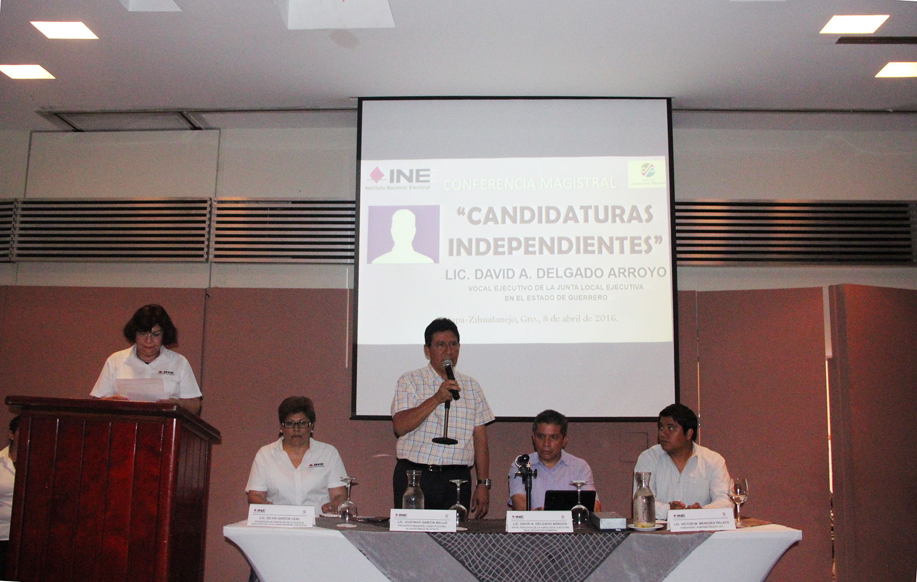 El presidente municipal Gustavo García Bello, acompañado de su esposa Maricruz Galana Leyva, presidenta del Sistema para el Desarrollo Integral de la Familia (DIF) en Zihuatanejo de Azueta, asistió como invitado de honor a la conferencia magistral sobre un tema íntimamente vinculado con los procesos electorales, como es el de las Candidaturas Independientes, cuyo ponente fue David Alejandro Delgado Arroyo, Vocal Ejecutivo de la Junta Local Electoral del Estado de Guerrero. El evento tuvo lugar este viernes en el hotel Emporio de Ixtapa y fue organizado por la Vocalía Ejecutiva de la 03 Junta Distrital del INE, a cargo de Silvia García Leal, en coordinación con la Fundación Josefina Pelayo.