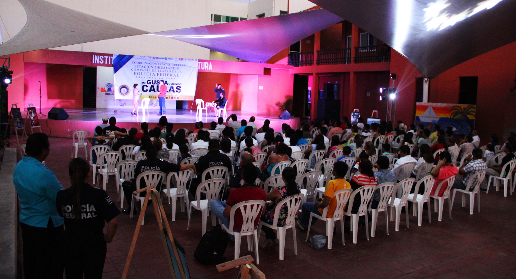 El pasado viernes en la explanada de la Casa de la Cultura se presentó la obra Me gusta cuando callas por parte de la compañía de Teatro de la Policía Federal en conjunto con la Coordinación Estatal Guerrero y la Estación Zihuatanejo de dicha corporación, cuya temática principal fue la prevención al Alcoholismo. En esta puesta teatral donde el Ayuntamiento que encabeza el presidente Gustavo García Bello ofreció todas las facilidades para que fuera posible la realización, estuvieron los directores Francisco Javier Urrutia Quintana, Marcela López Salgado, Cira Martínez Petatan, Luciano Pineda Quiroz del Instituto Municipal de la Cultura, DIF municipal, INMMUJER y Registro Civil, respectivamente, así como el Inspector Mauricio Garcidueñas Ramírez titular de la Estación de Zihuatanejo de la Policía Federal, Griselda Méndez Ayvar, titular del Enlace de Vinculación Social y elementos de esta corporación.