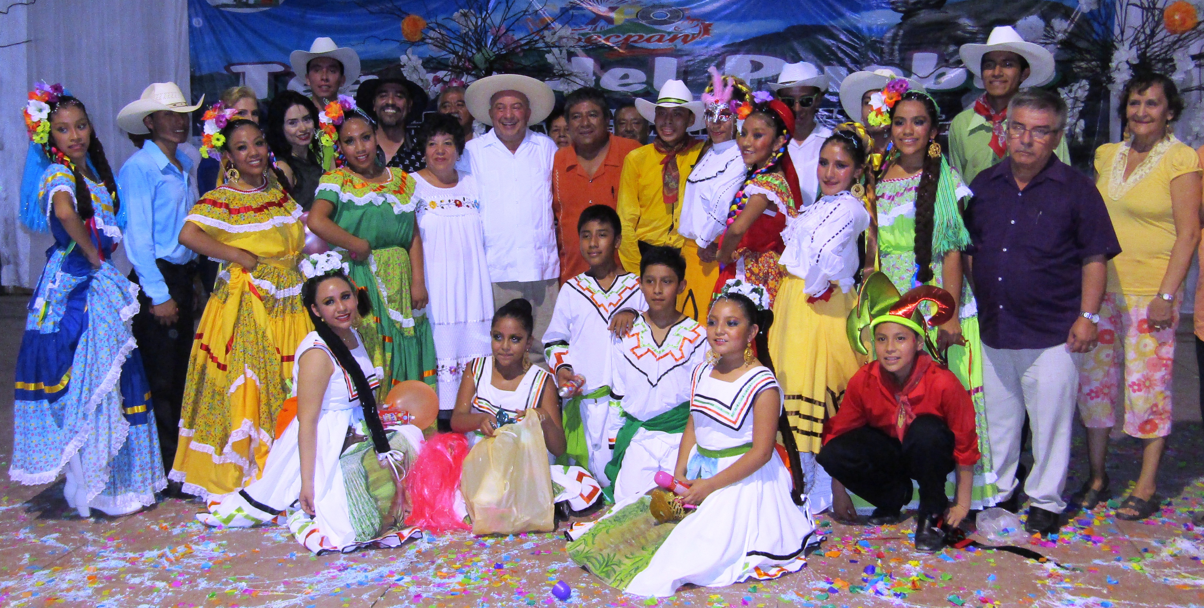 Tecpan de Galeana, Gro., 25 de abril de 2016.- Las funciones del viernes 22 y sábado 23 de abril del Teatro del Pueblo contaron con programas de lujo, ya que fueron muy atractivos para el público que abarrotó ambos días las instalaciones. Contando con la presencia del ingeniero Leopoldo Soberanis Hernández, Presidente Municipal Constitucional, quien clausuró el sábado las actividades culturales, el ballet Xochiquetzal de Tixtla lució sus mejores cuadros musicales el viernes y sábado pasados logrando la satisfacción de los asistentes. La función del día viernes incluso varios bailes regionales del estado de Guerrero, llegando a rematar con la danza de “La Iguana”, donde hicieron participar a varias personas del público. El sábado se presentaron cuadros musicales de varios estados de la República, como Yucatán, Chihuahua, Tamaulipas, Hidalgo y Sinaloa. Siendo con banda sinaloense que cerró la función con un “Carnaval”, con bailarines y bailarinas con antifaz, gorros, serpentinas, confeti, espantasuegras, luces de bengala; con mucha alegría y música contagiosa. Posteriormente, el alcalde Leopoldo Soberanis agradeció al maestro fundador de este ballet, Alejandro Salinas Hidalgo, su asistencia a la Expo Tecpan 2016, lo cual le dio mayor realce a estas celebraciones que se realizaron en memoria al 254 aniversario del natalicio del General Hermenegildo Galeana, prócer tecpaneco y héroe de nuestra Independencia Nacional. Antes de clausurar las actividades del Teatro del Pueblo, lo invitó a volver para traer más cultura a nuestro municipio. Después de clausurar el evento, el primer edil se tomó la foto del recuerdo con los integrantes del ballet Xochiquetzal de Tixtla.