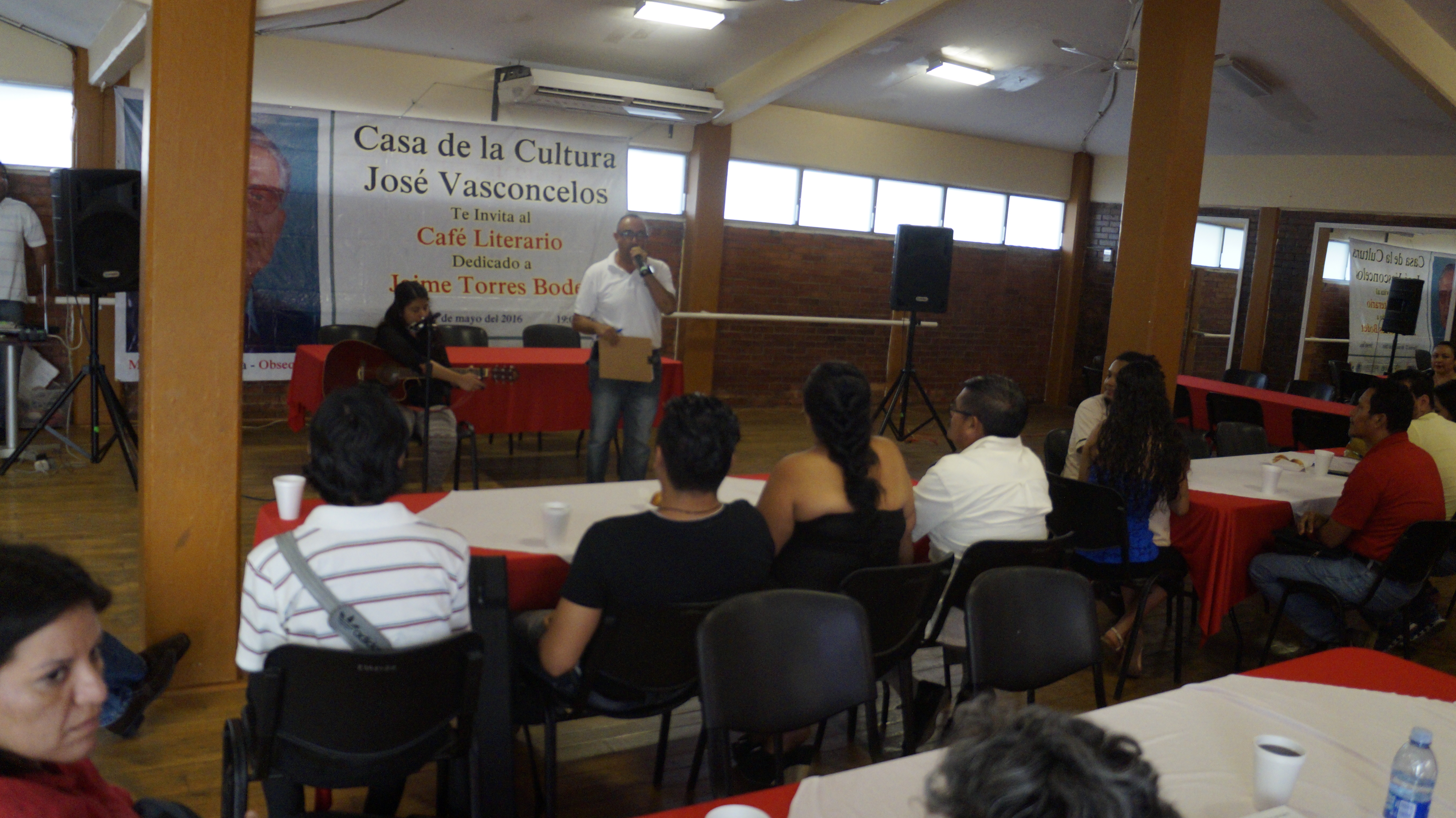 LÁZARO CÁRDENAS, MICH., 29 DE MAYO DEL 2016.-Durante la Tercera Edición del Café Literario que viene organizando la Casa de la Cultura “José Vasconcelos”, esta vez fue en homenaje al escritor y poeta, Jaime Torres Bodet, evento que logró concentrar a un gran número de personas que gustan de la literatura. El profesor Xavier Campos fue el encargado de dar una pequeña reseña de la vida y obra de Jaime Torres Bodet, quien dijo nació el 17 de abril de 1902 en la ciudad de México y considerado un escritor, ensayista y poeta, mismo que de 1948 a 1952 ocupo la Dirección General de La Unesco y falleció el 13 de mayo de 1974 a la edad de 72 años. “Su trabajo de alfabetización ha sido reconocido a lo largo de la historia, además de haber implementado la política de relaciones exteriores durante los inicios de la guerra fría”, señaló Xavier Campos. Por su parte, la directora de Casa de la Cultura “José Vasconcelos”, Ana Teresa Nuve Meza, reitero que se dará continuidad al Café Literario con el fin de seguir fomentando el gusto de la lectura en la población del municipio, lo cual es uno de los compromisos que tiene el presidente municipal, Armando Carrillo Barragán. Explicó que debido a las actividades del festejo del 67 aniversario de la instalación del Primer Ayuntamiento, Melchor Ocampo, hoy Lázaro Cárdenas, además de los del Día del Niño y La Madre, se suspendió temporalmente el café literario, el cual se volvió a reactivar el pasado viernes 27 de mayo. En el evento se contó con la participación de la alumna del Cet-Mar No.16, Jazmín Ayala Baltazar interpretando diversas melodías, con lo cual se amenizo el ambiente del evento literario cultural.