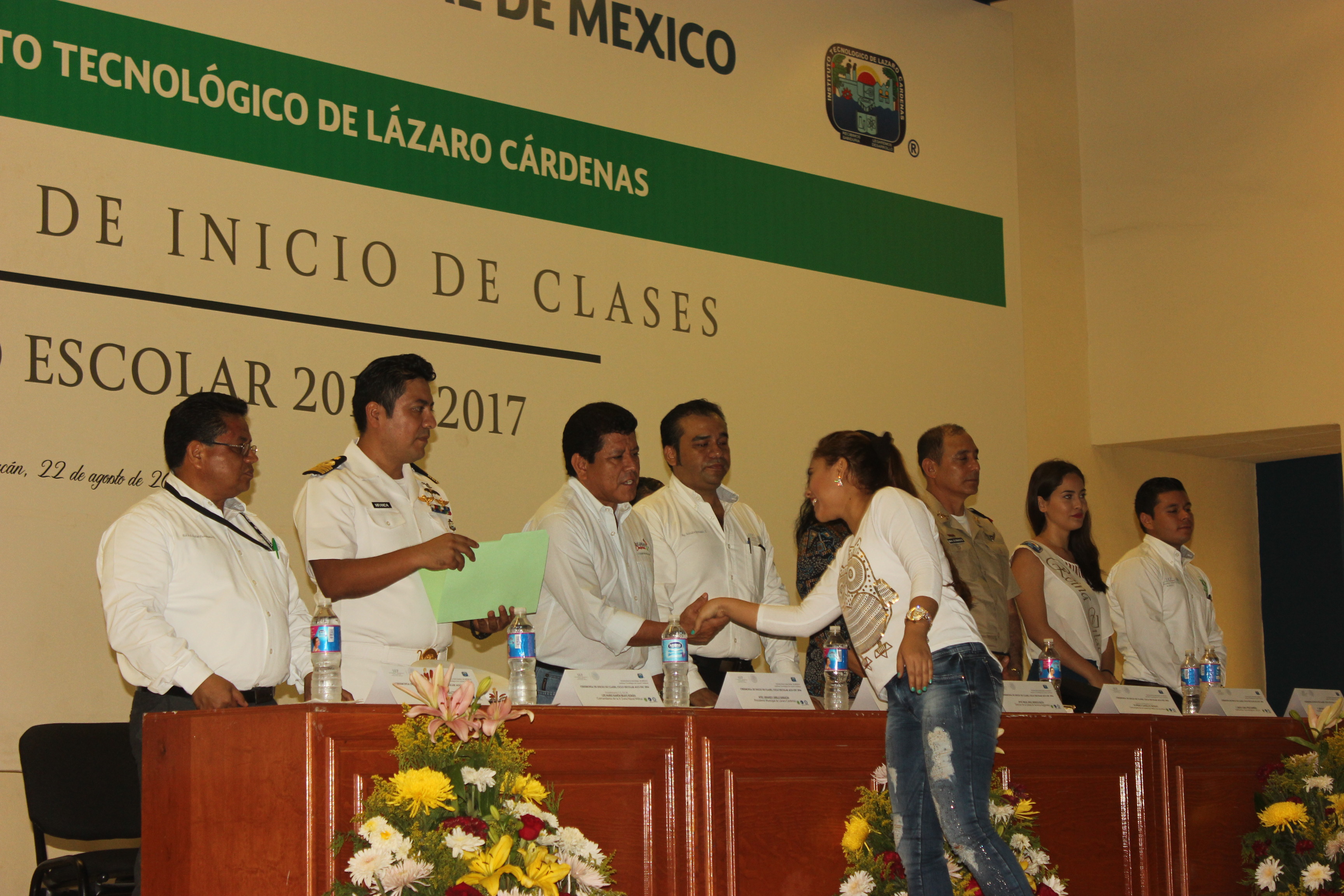 LÁZARO CÁRDENAS, MICH., 22 DE AGOSTO DEL 2016.- El presidente municipal, Armando Carrillo Barragán dio el formal arranque al ciclo escolar 2016-2017 del Instituto Tecnológico de Lázaro Cárdenas (ITLAC), exhortando a los 2 mil 909 estudiantes de las diferentes licenciaturas a que provechen la oportunidad de concluir una carrera. Así mismo, reconoció el nivel académico de la máxima casa de estudios de esta ciudad, destacando el profesionalismo de sus catedráticos, la entrega de sus directivos y el respaldo de todos los que laboran en la institución. “Ustedes no solo saldrán capacitados para ocupar un puesto en el mundo laboral, sino también tendrán las bases para crear sus propias empresas y generar fuentes de empleo que beneficien a los ciudadanos del municipio aprovechando las oportunidades de que LZC es sede de una Zona Económica Espacial (ZEE)”, indicó el maestro Carrillo Barragán. El alcalde enfatizó que se está trabajando en generar las condiciones que permitan poder aprovechar la ZEE y por ello que en días pasados sostuvo un segundo encuentro con el Embajador de la República Popular de China, Qiu Xiaoqi, quien comparte la importancia del puerto y que seamos sede de la Zona Económica Especial despertando el interés de empresarios chinos. Por su parte el subdirector de Servicios Administrativos, Salvador Hernández Heredia, en representación del Director del ITLAC, José Ángel Esquivel Tovar, dio la bienvenida a los 2 mil 909 estudiantes de los cuales 631 son de nuevo ingreso y 2 mil 278 de reingreso en las diferentes carreras que oferta la institución educativa. Asimismo dio un informe de las obras que se estarán desarrollando en el transcurso del ciclo escolar con el fin de dotar de mejores instalaciones a los alumnos, ello para que logren tener un mejor aprendizaje. El alcalde Armando Carrillo compartió el presidium con el Capitán de Fragata, Pedro Miranda Chávez, en representación de la Décima Zona Naval; el Coronel de Infantería, Víctor Manuel Maldonado Celis, Mayor de Ordenes de la Guarnición Militar; María Concepción Chávez Becerra responsable del Área Jurídica de la Unidad de Servicios Regionales; Felipe Palomares Salceda, Subdirector Académico y Bianca Yareli Pérez Barrera, señorita Tecnológico 2015, quienes hicieron la entrega de reconocimientos a los alumnos que obtuvieron los mejores promedios de enero-junio del 2016 y a los maestros que obtuvieron los primeros lugares en la encuesta al Desempeño Docente.
