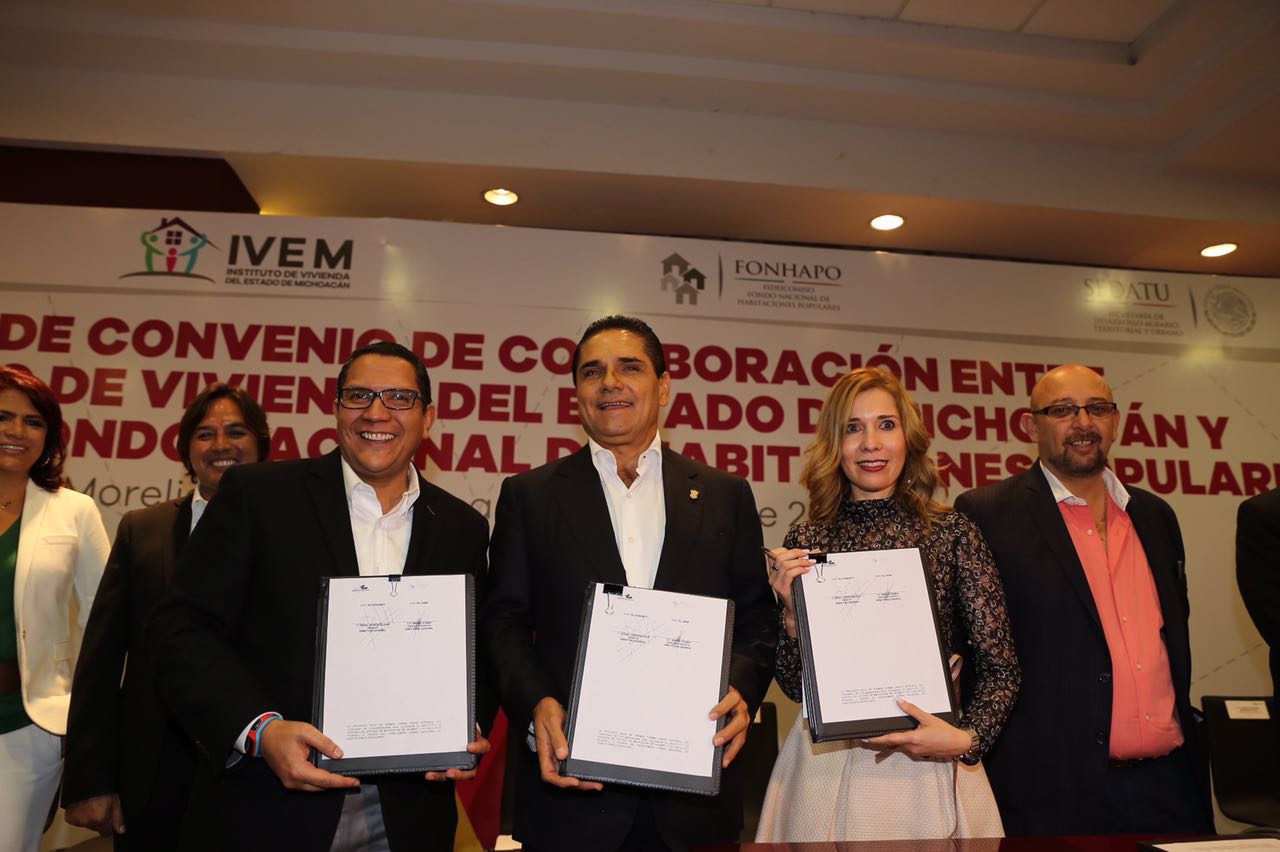 • El mandatario y el titular del Fonhapo, Ángel Ramón Islava, firmaron el acuerdo que beneficiará a entre 2 mil 500 y 3 mil mujeres michoacanas.
