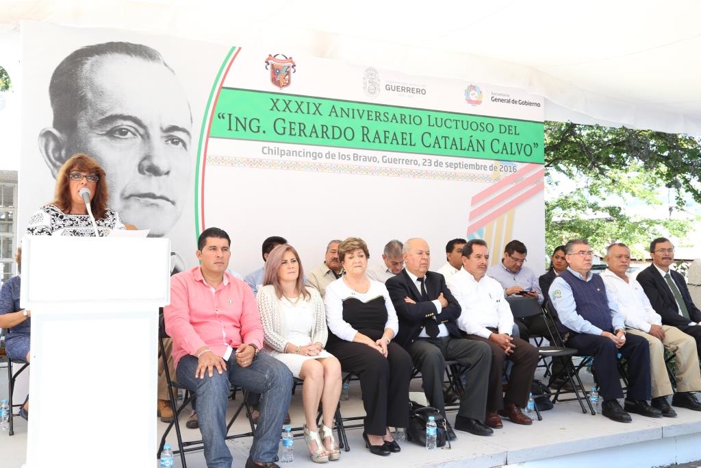 Asimismo, refirió que quienes tienen una responsabilidad pública, no importa del nivel que sea, tienen el deber de ajustar su actuación para que el pueblo diga, le echaron ganas, ayudaron y no se robaron el dinero del pueblo. Por su parte, la secretaria de Cultura, Alicia Margarita Sierra Navarro, realizó una semblanza del exgobernador, ingeniero, militar y político guerrerense, de quien dijo, nació el 3 de octubre de 1894 en Chilpancingo, y murió en la Ciudad de México el 23 de septiembre de 1977. Hijo de Delfino Catalán y de Eustolia Calvo. Estudió primaria y secundaria en su lugar de origen. Posteriormente se trasladó a la Ciudad de México donde ingresó al Ejército Constitucionalista, fue nombrado oficial–alumno de la Escuela de Estado Mayor, con el grado de teniente, y se graduó de Ingeniero Artillero e Ingeniero Industrial. En 1933 fue designado director de Estudios Militares; poco después, consultor técnico del Colegio Militar; de julio de 1935 a julio 1936 fue comandante del primer Batallón de Infantería, y de 1937 a 1939, comandó el 14 Batallón. El 1 de julio de 1941 tomó posesión como gobernador constitucional del estado de Guerrero, sustituyó al profesor Carlos F. Carranco Cardoso; entregó el poder el 1 de abril de 1945 al general Baltasar R. Leyva Mancilla. Durante su administración se publicó la Ley Orgánica del Poder Judicial, se crearon las Defensorías de Pobres, la Escuela Normal Mixta se transformó en Colegio del Estado, hoy Universidad Autónoma de Guerrero, se dotaron 74 ejidos con una superficie total de 163 000 hectáreas. Se abrió la carretera de terracería de Acapulco–Zihuatanejo, el camino Acapulco–Puerto Ángel, la brecha Tlapa–Huamuxtitlán, se concluyó el camino Iguala–Coyuca de Catalán y la carretera Taxco–Zacualpan. Es el primer gobernante emanado de la Revolución que terminó el periodo constitucional para el cual fue electo. En el evento al que asistieron familiares del exgobernador Gerardo Rafael Catalán Calvo; funcionarios del gobierno del estado, diputados locales, regidores del ayuntamiento de Chilpancingo, y estudiantes de escuelas secundarias, se realizó guardia de honor y se colocó una ofrenda floral.