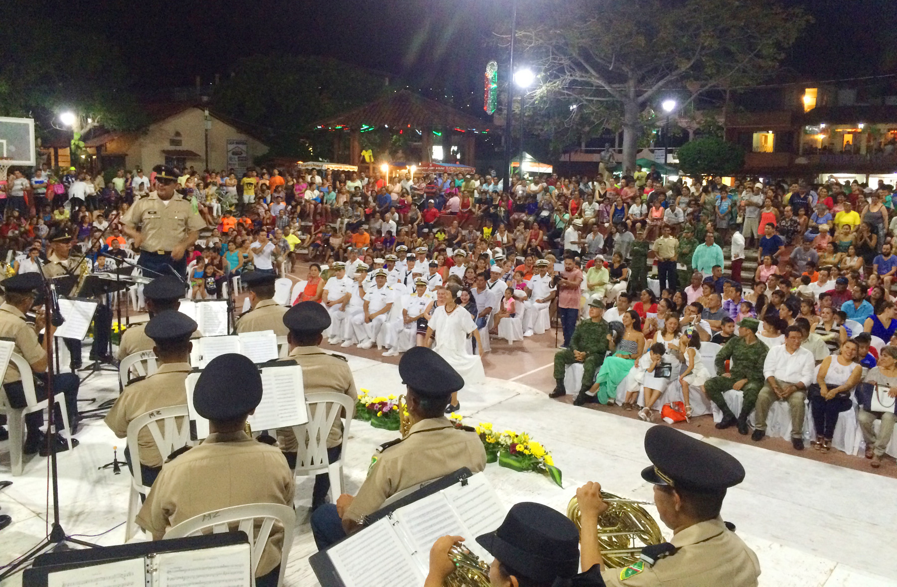 Zihuatanejo, Gro., 25 de Septiembre 2016.- Con éxito y teniendo una gran respuesta por parte del público zihuatanejense que abarrotó las gradas de la cancha municipal, se desarrolló el concierto que ofreció la Banda de Música de la Novena Región Militar denominado “Fiestas Patrias Zihuatanejo 2016”; dicha presentación duró alrededor de dos horas, tiempo en el cual los asistentes se deleitaron con temas de la autoría de Juan Gabriel, Joan Sebastian y temas de mucha tradición en el país como Huapango de Moncayo, entre otros. El pasado sábado en dicho evento que terminó por ser muy aclamado por parte de los asistentes, el Alcalde Gustavo García Bello y su esposa, la Presidenta del DIF, Maricruz Galeana Leyva, entregaron los reconocimientos a el Comandante del 75 Batallón de Infantería con sede en Petatlán, Jorge Juan Tapia Padilla y el otro al Director de la banda el Teniente músico, Valentín López Olmedo. La banda de música de la novena región militar tocó temas como Hasta que te conocí, Así fue, Secreto de Amor, Amorcito Mío autorías de los canta-autores de la música mexicana como son Alberto Aguilera Valadez y José Manuel Figueroa, mejor conocidos como Juan Gabriel y Joan Sebastian, entre otros temas como Huapango de Moncayo, México Lindo, Caminos del Sur y algunos danzones. Cabe destacar que durante este concierto por parte de esta banda de la novena región militar que está integrada por 41 elementos organizados en tres secciones, se contó con la participación del club de danzoneros del DIF municipal, así como del taller de ballet folklórico de la casa de la cultura de este municipio. En este concierto, estuvo presente la síndica, Nelly María Zurita Allec, los regidores, Rosario Nidia Álvarez González, Efrén Ruiz Cortez, el secretario general del Ayuntamiento, Homero Rodríguez Rodríguez, así como el Alcalde del municipio de Petatlán, Arturo Gómez Pérez y su esposa Leticia Rodríguez de Gómez, entre otras personalidades.