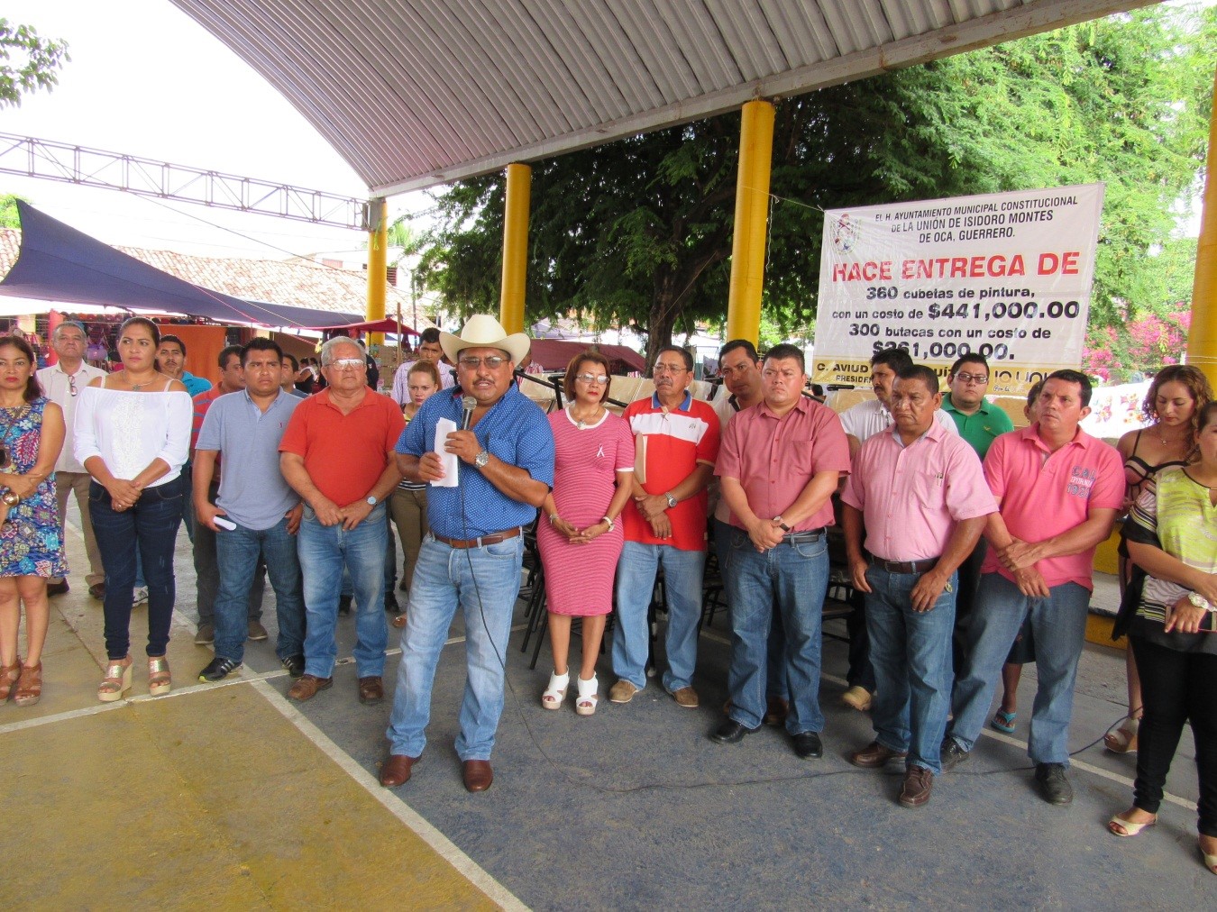 La Unión, Guerrero. 25 de Octubre de 2016. El presidente Aviud Rosas Ruiz en compañía de su comuna, entrego cubetas de pintura y butacas a 43 escuelas de las diferentes comunidades de la Unión. También entregó uniformes al personal de protección civil municipal.