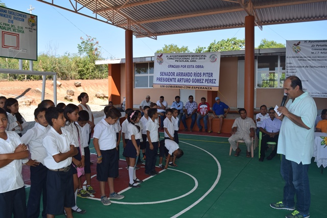 Este lunes el presidente municipal de este lugar Arturo Gómez Pérez a pesar de ser ya los últimos días de trabajo formal de la administración en este su primer año de gestión y de estar ya oficialmente el periodo vacacional para la totalidad de los funcionarios y empleados de la comuna inauguró la techumbre y la cancha de usos múltiples de la escuela primaria de la comunidad del Cayacal la que dijo era parte del paquete de obras cuyos recursos por gestión de su administración etiquetó el senador Armando Ríos Píter. Acompañado por su esposa la señora Leticia Rodríguez de Gómez, de algunos regidores y funcionarios de la administración que preside, el primer edil le hizo un reconocimiento público al senador Armando Ríos Píter, de quien dijo siempre ha distinguido con su cariño al municipio, agradeciéndoles que en este único año de su administración le etiquetó cerca de 12 obras entre pavimentaciones y techumbres escolares, principalmente la modernización del sistema de agua potable del municipio, en el que se incluyen sistemas de bombeo nuevos y la profundización de los posos, para dejar ya que el abasto del agua potable del municipio dependa de las galeras del río. También anunció en su disertación que el distinguido amigo de Petatlán, Armando Ríos Píter estará visitando este miércoles 21 del presente al municipio, en las que recibirá una informe de los avances y las metas logradas con los recursos que en su momento etiquetó para aplicarse en beneficio de la población, a la que invitó para que este día reciba el mensaje que nuestro líder ya a nivel nacional nos entregara en esta fecha en el zócalo de la ciudad. Fue la menor Giselle Aguilar quien con palabras sencillas le agradeció al edil la obra la que dijo que estaba bien hecha y que les iba a servir de mucho, y para muchas actividades que ellos realizan en ese centro de estudio, el que por primera vez recibe una obra y atención de una autoridad, lo que seguramente la comunidad no olvidará, enviándole un saludo al senador Armando Ríos Píter por todos esos beneficios que ha enviado por medio del presidente a las comunidades como el Cayacal.