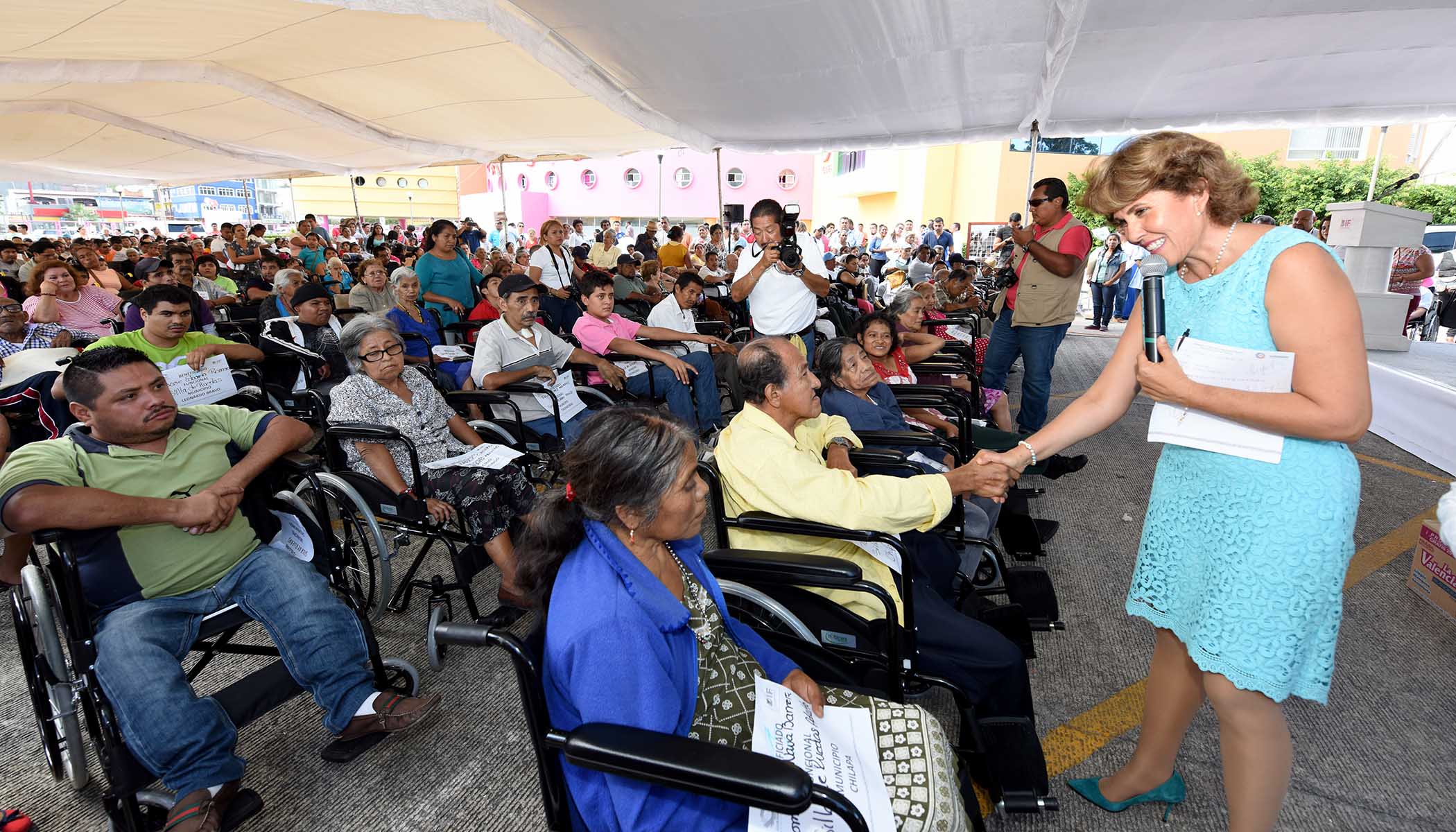 Chilpancingo, Gro., 2 de Diciembre de 2016.- Para conmemorar el Día Internacional de las Personas con Discapacidad, la Presidenta del Patronato DIF Guerrero, Mercedes Calvo de Astudillo entregó aparatos funcionales, proyectos productivos, lentes y becas escolares, con una inversión de 2.5 millones de pesos, donde refrendó el compromiso del gobernador Héctor Astudillo Flores de mejorar el nivel de vida de este sector vulnerable. En su mensaje a los beneficiarios, Mercedes Calvo destacó que » las personas con alguna discapacidad tiene talento y capacidad para desarrollar actividades productivas y nosotros como gobierno le estamos brindando las herramientas y oportunidades para que salgan adelante y mejoren las condiciones de vida de sus familias». Durante el evento se entregaron 57 becas a niños que estudian en los Centros Atención Múltiple; 60 lentes adultos mayores; 380 sillas de ruedas, andaderas, bastones, muletas y bastones; 30 tiendas de abarrotes y Ortoprotesis y se continuará con la entrega en las demás regiones que sumarán un total de 2.5 millones de pesos. “Señora Mercedes, muchas gracias por siempre tener ganas de ayudar a los demás, dele nuestro agradecimiento a su esposo el gobernador Héctor Astudillo, pues reconocemos que desde el inicio de su gobierno nuestro sector se ha visto beneficiado con apoyos y programas que no ayudan a mejorar nuestra economía y la calidad de vida”, expresó Guadalupe nava, beneficiara de una silla de ruedas del municipio de Tixtla.
