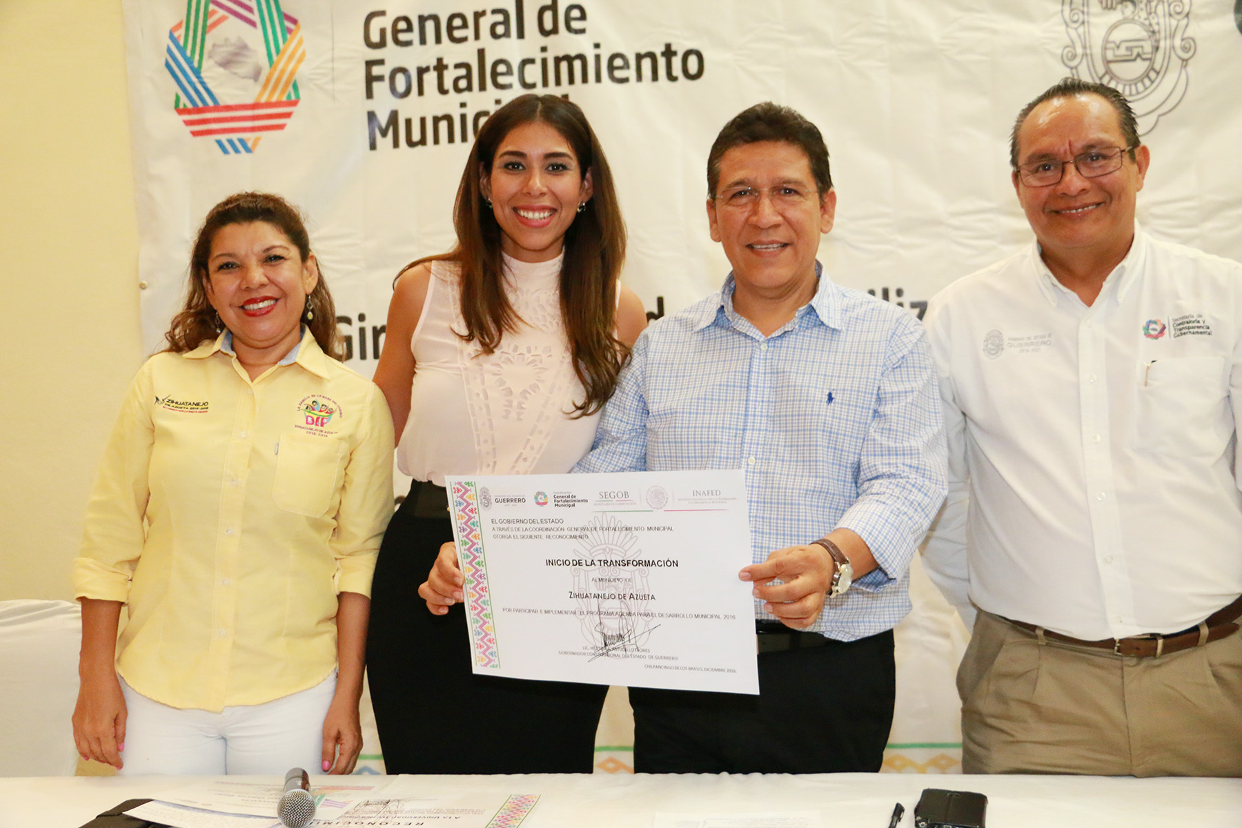 El alcalde Gustavo García Bello, acompañado de su esposa Maricruz Galeana Leyva, presidenta del DIF municipal, asistió a la clausura del curso-taller de Sensibilización y Capacitación en Perspectiva de Género y Atención a la alerta de Violencia de Género en los municipios del estado, organizado por la Coordinación General de Fortalecimiento Municipal, cuya titular es Gisela Ortega Moreno y que fue la encargada de clausurar este evento que se desarrolló durante los días lunes y martes en un conocido hotel de Ixtapa, con la ponencia de diferentes temas por parte de María de la Luz Vega Aguirre para servidores públicos de la actual administración pública local. En este acto, el presidente García Bello recibió un par de reconocimientos, el primero a nombre del gobernador Héctor Astudillo Flores para el municipio de Zihuatanejo por participar e implementar el programa Agenda para el Desarrollo Municipal 2016, y el segundo de manos de Ortega Moreno, por su participación en este curso-taller.