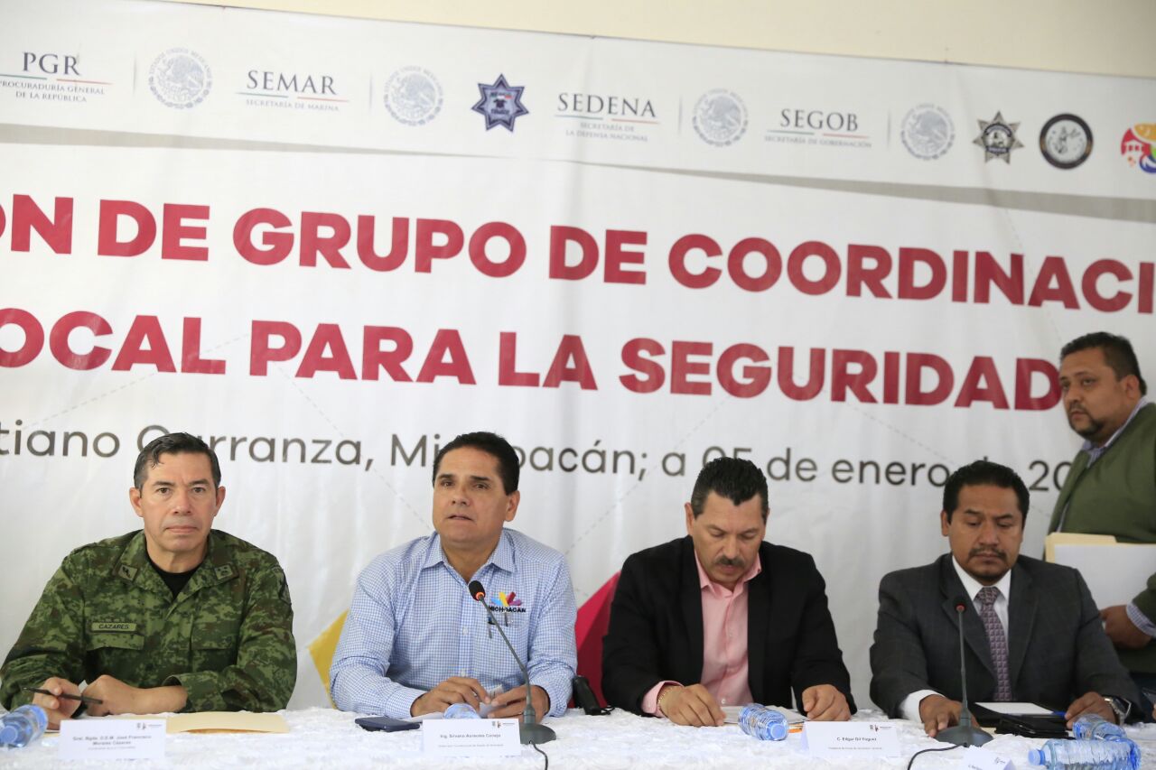 Venustiano Carranza, Michoacán, a 5 de enero de 2017.- En seguimiento a la estrategia para la seguridad que se implementa en la zona limítrofe con el estado de Jalisco, esta tarde el Gobernador de Michoacán, Silvano Aureoles Conejo, encabezó la reunión con el Grupo de Coordinación Local para la Seguridad en esta región de la Ciénaga de Chapala. Acompañado de los integrantes del Gabinete de Seguridad estatal, el mandatario michoacano escuchó las inquietudes de presidentes municipales de Sahuayo, Villamar, Jiquilpan, Marcos Castellanos, Pajacuarán, Venustiano Carranza, Cojumatlán, Vista Hermosa, Chavinda e Ixtlán. De igual manera escuchó a un grupo de empresarios de la región, como parte de su compromiso de atender y dar seguimiento puntual a las inquietudes de los sectores productivos de las diversas zonas de la entidad. En el encuentro, Aureoles Conejo compartió los resultados de las acciones que se han implementado en materia de seguridad y procuración de justicia en esta zona, derivado de la estrategia de coordinación entre los tres órdenes de gobierno. Entre los resultados destaca la detención de 22 personas en diferentes acciones operativas y la recuperación de 17 vehículos con reporte de robo, en el periodo comprendido del 21 de diciembre pasado al 3 de enero de este año. Para tal fin, se mantienen en operación puestos de control instalados en los tramos carreteros que conectan a Michoacán con Jalisco, como Yurécuaro – La Rivera, Cojumatlán – Atizapan y Vista Hermosa – La Barca, y otras que limitan con Guanajuato. En esas detenciones han sido aseguradas siete armas de fuego, tres cargadores, 53 cartuchos útiles, un explosivo de fabricación casera, un chaleco balístico, dos tácticos, una pechera, una gorra con un escudo y el nombre del estado de Jalisco bordado en el frente, y droga en dosis individuales. En la reunión de este jueves, los ediles mostraron su respaldo al Gobernador y manifestaron su confianza en las acciones que realizan autoridades estatales y federales para recuperar la tranquilidad y garantizando el impulso de la actividad productiva de esta importante zona de la entidad. Estuvieron presentes en esta reunión el secretario de Seguridad Pública, Juan Bernardo Corona Martínez; el procurador General de Justicia, José Martín Godoy Castro; el comandante de la 21 Zona Militar, General José Francisco Morales Cázares; el vocal Ejecutivo del Centro Estatal para el Desarrollo Municipal, Carlos Paredes Correa, y el secretario de Desarrollo Rural y Agroalimentario, Francisco Huergo Maurín. Además de los munícipes de Venustiano Carranza, Edgar Gil Yoguez; de Sahuayo, Rodrigo Sánchez Zepeda; de Villamar, Joel López Padilla; de Jiquilpan, José Clemente Covarrubias Castillo; de Marcos Castellanos, Rolando González Chávez; de Pajacuarán, María Elena Macías Sánchez; de Cojumatlán, Enrique Múgica Sánchez; de Vista Hermosa, Nicolás Ramírez Zaragoza; de Ixtlán, Angel Macías Mora y de Chavinda, Luis Maciel Mendoza.