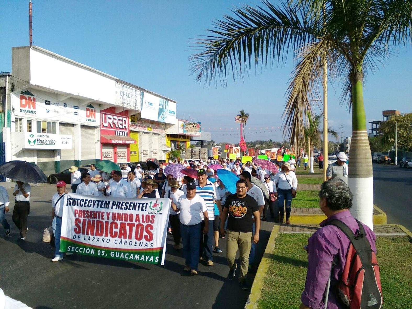 Uno de los contingentes compuesto por más de mil personas, encabezados por maestros afiliados a la Coordinadora Nacional de Trabajadores de la Educación (CNTE), partió de la avenida Las Palmas, frente al centro comercial Plaza Las América, para recorrer parte de esa avenida y de la Lázaro Cárdenas, donde también se congregaron trabajadores del sector Salud, de Telmex y de los sindicatos que agrupan a empleados al servicio del plantel Cecytem 05 Guacamayas y del Centro de Estudios Tecnológicos y de Servicios número 34 (Cetis 34). El nutrido contingente dio vuelta sobre la glorieta a Melchor Ocampo, para concluir la marcha frente a las instalaciones de la Presidencia Municipal. Por otro lado, cientos de trabajadores de las empresas ArcelorMittal y Fertinal, afiliados a las secciones 271 y 274 del Sindicato Minero Nacional, como ya ha sido una costumbre el primero de mayo de cada año, tras celebrar una asamblea extraordinaria en el Salón Minero, ubicado sobre la avenida Heroica Escuela Naval Militar, donde se hace un recuento de la lucha de ese gremio, realizaron una marcha por toda esa avenida, hasta entroncar con la avenida Lázaro Cárdenas para luego tomar la Constitución de 1917 y terminar la marcha frente al acceso principal de la empresa acerera, donde se ubica la Plaza de Los Mártires. Durante el trayecto de la marcha, los maestros centistas exigían entre sus principales peticiones, que el gobierno del estado les cubra cuanto antes, alrededor de 80 millones de pesos que adeuda al sector entre sueldos y bonos de maestros, y la entrega de plazas automáticas a estudiantes egresados de las diferentes escuelas Normales de la entidad. Asimismo, otra de las exigencias del magisterio llamado también democrático de la región costa sierra de la entidad, fue el esclarecimiento total de las muertes de comuneros de Arantepacua, y la libertad de todos los que ellos llaman “presos políticos”. También dejaron en claro, que no aceptan ni acudirán a una nueva etapa de la evaluación educativa, y desde luego insistieron también en que se eche abajo la Reforma Educativa y a la Laboral. En tanto los trabajadores del sector Salud, principalmente los que laboran en la clínica del ISSSTE, externaron su rechazo a la universalización de la salud, en tanto que los trabajadores de Teléfonos de México, pedían que no se divida su empresa como lo pretende dicen, el Ifetel, porque eso es atentar contra la autonomía sindical. En esta ocasión, trabajadores al servicio del ayuntamiento porteño ni del Comité de Agua Potable y Alcantarillado de Lázaro Cárdenas, no participaron en esta celebración del Día del Trabajo.