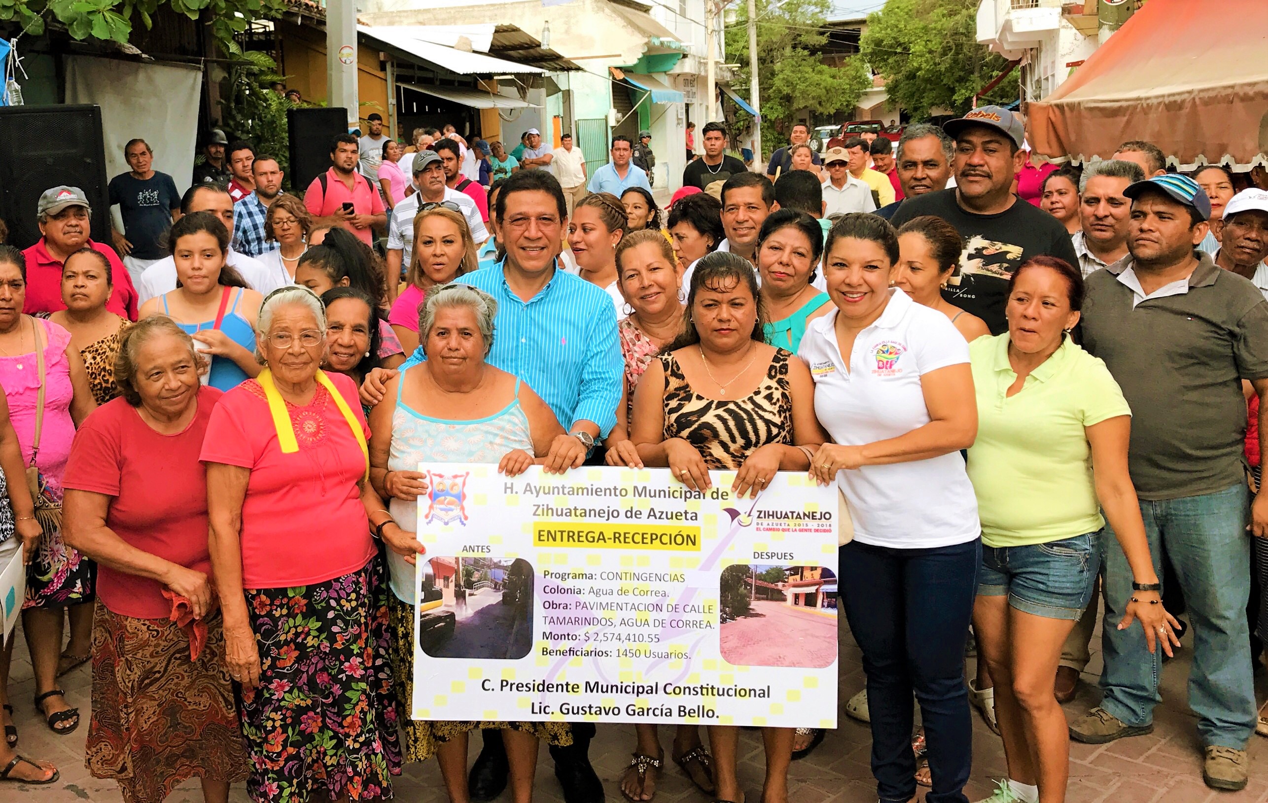 Zihuatanejo, Gro., 25 de junio de 2017.- El presidente municipal Gustavo García Bello, acompañado de su esposa Maricruz Galeana Leyva, presidenta del DIF Zihuatanejo, y colaboradores de la administración pública local, entregó este viernes la pavimentación de la calle Tamarindos de Agua de Correa, obra que los vecinos de la localidad consideran histórica por el alto impacto social que representa para más de mil 500 habitantes del núcleo poblacional. En nombre de sus representados, la comisaria municipal de Agua de Correa, María Idolina García Mercado, agradeció que el gobierno encabezado por el alcalde García Bello haya pavimentado esta centra vialidad del mencionado poblado, la cual por mucho tiempo permaneció en malas condiciones por la falta de atención. Mientras que el director de Obras Públicas, Enrique Hernández Gutiérrez, explicó que se pavimentaron 210 metros lineales con concreto hidráulico, además de que se modernizaron los servicios de drenaje sanitario y agua potable en dicha calle, que conecta con 11 colonias asentadas en la zona de Agua de Correa. Silverio Valle Rodríguez, oriundo y vecino de toda la vida del lugar, afirmó que “es una obra muy importante, muy sentida, muy requerida por la población”, al tiempo de hacer notar que por espacio de unos 40 años esta calle de Agua de Correa estuvo revestida de piedra, material que ya había cumplido su vida útil. Sostuvo que esta pavimentación le viene a dar un realce a Agua de Correa, al ofrecer una mejor imagen urbana, después de haber permanecido en una situación de abandono. “La gente está contenta con esta obra”, resumió. Para Paula Rivera Cadena, locataria del mercado de Agua de Correa, enfatizó que “quedó muy bien esta calle, para toda la gente, ahora tiene una imagen muy bonita, a como estaba antes”. Por su parte el presidente Gustavo García Bello, informó que la calle Tamarindos se pavimentó con recursos del programa Contingencias para satisfacer una necesidad prioritaria de los habitantes de Agua de Correa. Además, anunció que en los próximos dos meses estará inaugurando más de 100 obras de diferentes rubros en colonias y comunidades de Zihuatanejo de Azueta, donde también se pondrán en marcha otras acciones de beneficio social. En esta inauguración, también se contó con la presencia del secretario del Ayuntamiento, Homero Rodríguez Rodríguez, y directores de varias dependencias municipales.
