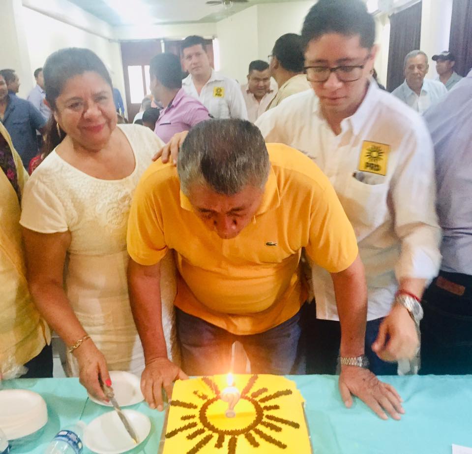 Zihuatanejo, Gro., 25 de Mayo 2019.- Este sábado Amador Campos Aburto, expresidente municipal de Zihuatanejo y lider moral estatal de la corriente “Nueva Mayoría” del Partido de la Revolución Democrática (PRD), fue sorprendido por militantes, representantes del Sol Azteca en la Costa Grande y el ex presidente municipal de Acapulco, Evodio Velazquez Aguirre, quienes le festejaron su cumpleaños durante la apertura de reafiliaciones celebrada en este centro turístico.