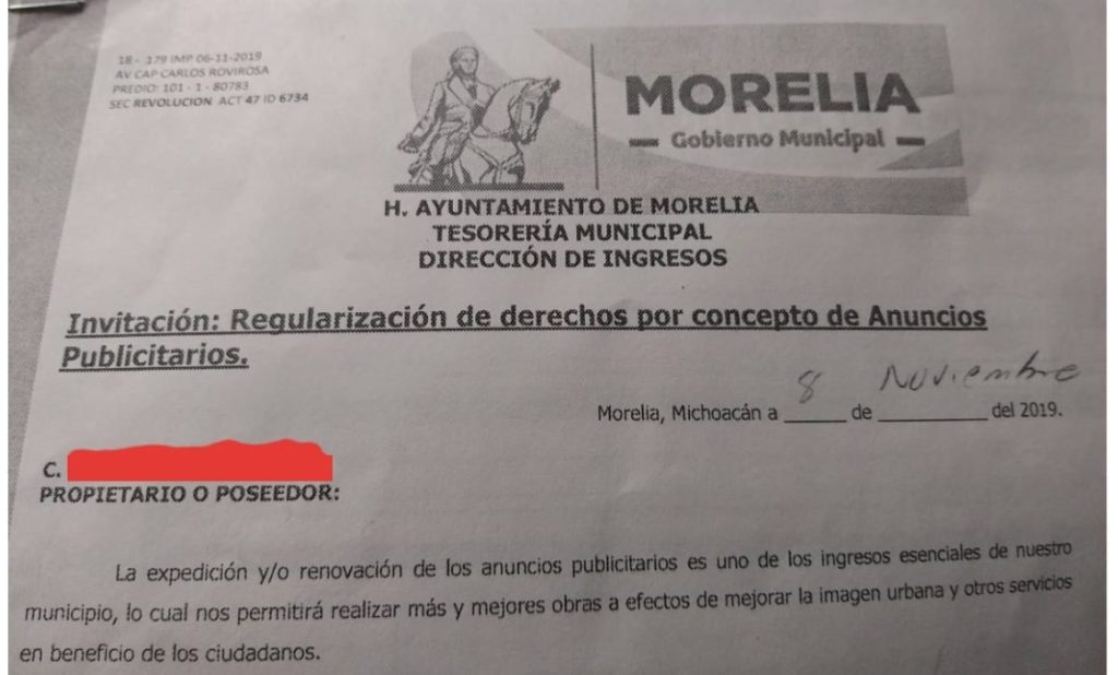 Propietarios y trabajadores de micro y pequeños comercios sitos en la capital michoacana señalaron la entrega, a partir del pasado 8 de noviembre, de invitaciones emitidas por la Tesorería Municipal y la Secretaría de Movilidad y Espacio Público para solventar irregularidades en la tenencia de licencias para estas estructuras e implementos, así como liquidar adeudos por concepto de derechos de publicidad. De acuerdo con la invitación, que se acompaña por una solicitud para tramitar una licencia de anuncios publicitarios, “la expedición y/o renovación de los anuncios publicitarios es uno de los ingresos esenciales de nuestro municipio, lo cual nos permitirá realizar más y mejores obras a efectos de mejorar la imagen urbana y otros servicios en beneficio de los ciudadanos”. A regularización, espectaculares, pendones, letreros, lonas y anuncios adosados a negocios Antonio Godoy González Vélez, secretario de Movilidad y Espacio Público, refirió que las invitaciones emitidas por el gobierno municipal corresponden al programa de regularización implementado a inicio de este año, con la prioridad de verificar las condiciones en que se encuentran los anuncios publicitarios colocados en espacios y vías públicas. No obstante, precisó que además se revisan las estructuras y los implementos de promoción que se localizan en las fachadas de los negocios, ya que, si bien no generan un riesgo inmediato a la seguridad de los transeúntes, tienen un impacto negativo en la imagen urbana y ocasionan contaminación visual. Así, el programa pretende impulsar la limpieza de la imagen de las vialidades con alta concentración de establecimientos mercantiles que se anuncian mediante lonas y anuncios rotulados adosados a sus muros, promociones en vitrinas de cara al exterior de los locales y letreros, principalmente lumínicos, que indican las existencia de un oferente de bienes o servicios. Godoy González Vélez explicó que, pese a que los objetivos de la dependencia son mejorar la imagen urbana y que los ciudadanos tengan en claro que los anuncios publicitarios deben satisfacer requisitos para no ser una amenaza a la integridad de los transeúntes, la expectativa es que la regularización conlleve la recaudación de ingresos para el ayuntamiento capitalino. “Los permisos para los anuncios tienen costos, y estos son variables en función de su el letrero es luminoso o no, si es un rótulo, una lona o un anuncio tipo bandera, pero todos están sujetos a regularización”, reiteró el secretario de Movilidad y Espacio Público. Al momento, indicó, no se tienen cifras actualizadas de la cantidad de invitaciones entregadas a micro y pequeños comercios para la regularización de sus anuncios publicitarios, como tampoco de la recaudación proyectada y de la proporción de estructuras e implementos intervenidos y la estimación del universo pendiente de verificar. Cabe recordar que la propuesta de presupuesto de ingresos 2020 para el ayuntamiento de Morelia prevé la instrumentación de un cobro de derechos por concepto de anuncios publicitarios, conforme la naturaleza y ubicación de los mismos, debido a que, según la Tesorería Municipal, hasta ahora el cobro se efectúa de forma genérica.