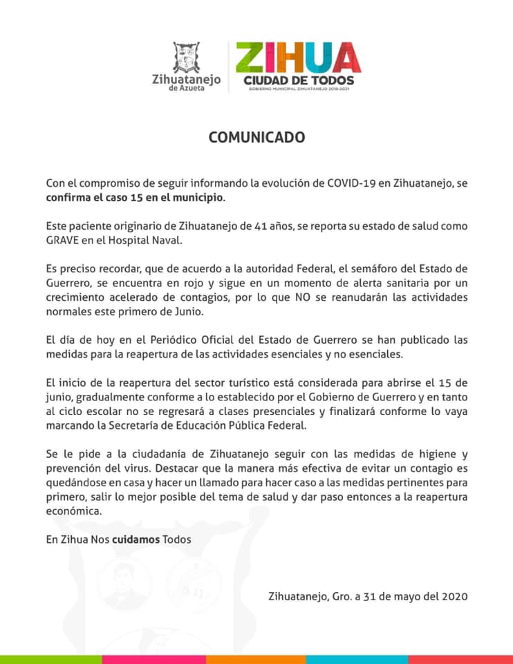 General Gobierno de Zihuatanejo reporta el caso 15 de Coronavirus. Ahora un masculino de 41 años que se encuentra grave hospitalizado en hospital Naval. 6 años hace adolfo Siguenos y dale Like: No se reanudarán actividades esenciales a partir de este lunes 1 de junio se reitera Siguenos y dale Like: Más historias General Trágico accidente en La Unión: mujer muere al ser arrollada por un automóvil 6 meses hace adolfo General Muelle de Zihuatanejo, la evolución con el tiempo 6 meses hace adolfo General Suman 37 fall3ci2s por lluvias en cuatro estados; Hidalgo, el más afectado 6 meses hace adolfo Deja una respuesta Cancelar la respuestaTu dirección de correo electrónico no será publicada. Los campos obligatorios están marcados con *Comentario * Nombre * Correo electrónico * Web Δ