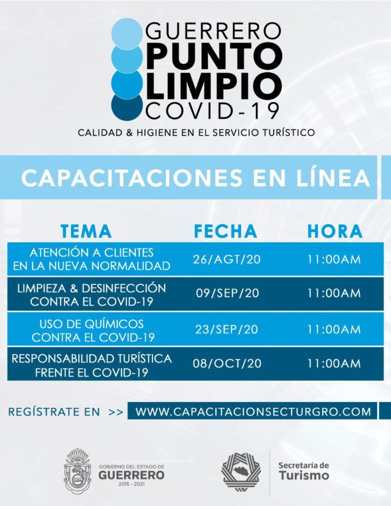 La capacitación tendrá una duración de 4 días en 4 módulos: La Atención a Clientes en la Nueva Normalidad el 26 de Agosto; Limpieza y desinfección contra Covid-19, el 9 de Septiembre; Uso de Químicos contra el Covid-19 el 23 de Septiembre y Responsabilidad Turística frente a la infección el 8 de Octubre, cabe mencionar que todos los cursos iniciarán en punto de las 11 de la mañana y para registrarse se debe de ingresar a la página web capacitacionsecturgro.com, donde se proporcionará la clave de acceso.