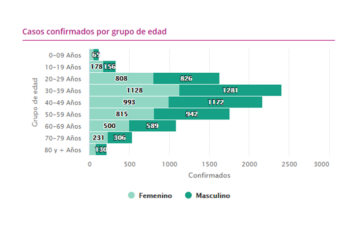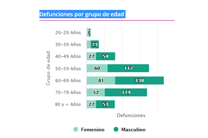 Por grupo de edad, las personas entre 30 y 39 años tienen mayor incidencia de contagios, con 1,128 en mujeres y 1,281 en hombres; sin embargo, el mayor número de fallecimientos ocurre en el rango de 60 a 69 años (81 mujeres y 119 hombres).