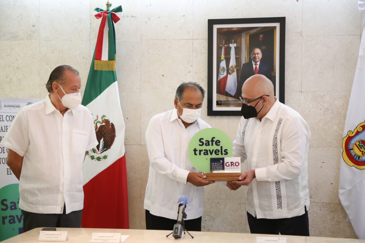 En las oficinas de la Promotora Turística de Guerrero, el gobernador Héctor Astudillo, del representante del Consejo Mundial de Viajes y Turismo, Alberto Petrearse, el sello distintivo «Safe Travels», acompañado por el secretario de Turismo, Ernesto Rodríguez Escalona y el subsecretario de Promoción Turística, Jesús Radilla Calderón, el secretario de Salud, Carlos de la Peña Pintos y el presidente de FIDETUR, Eligio Serna Nájera.