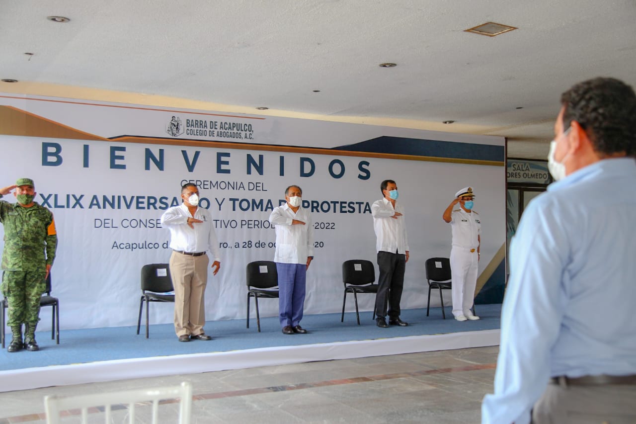 Acapulco, Guerrero.- En una ruta de diálogo y cercanía con los grupos de la sociedad civil organizada, el gobernador Héctor Astudillo Flores asistió como invitado a la celebración del 49 aniversario de la Barra de Acapulco Colegio de Abogados A.C. y atestiguó la toma de protesta a los integrantes del Consejo Directivo 2020-2022.