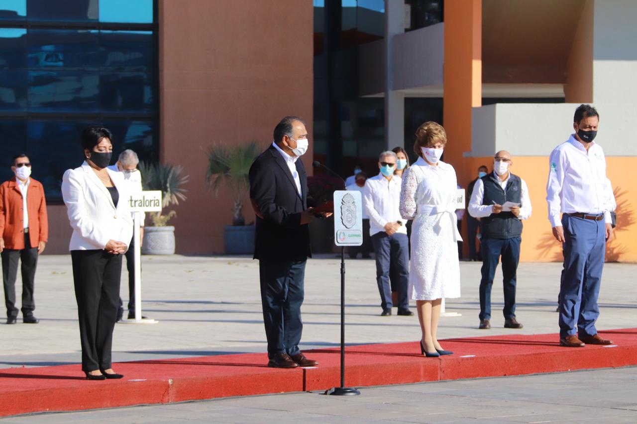 Lo anterior durante la ceremonia e izamiento de bandera del mes de diciembre, donde estuvo acompañado de su esposa, la presidenta del DIF Guerrero, Mercedes Calvo, de los representantes de los Poderes Legislativo y Judicial e Integrantes del gabinete estatal.