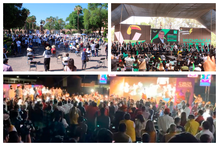 En primer lugar destacó el caso del partido Morena que, pese a no contar con todavía con un candidato oficial a la gubernatura, convocó a un evento en el que se reunieron unas 150 personas en la Plaza Jardín Morelos de Morelia. Si bien se instalaron filtros sanitarios y sillas con una distancia de aproximadamente un metro y medio entre sí, los asistentes violaron esta separación para tener contacto físico a lo largo de la reunión.