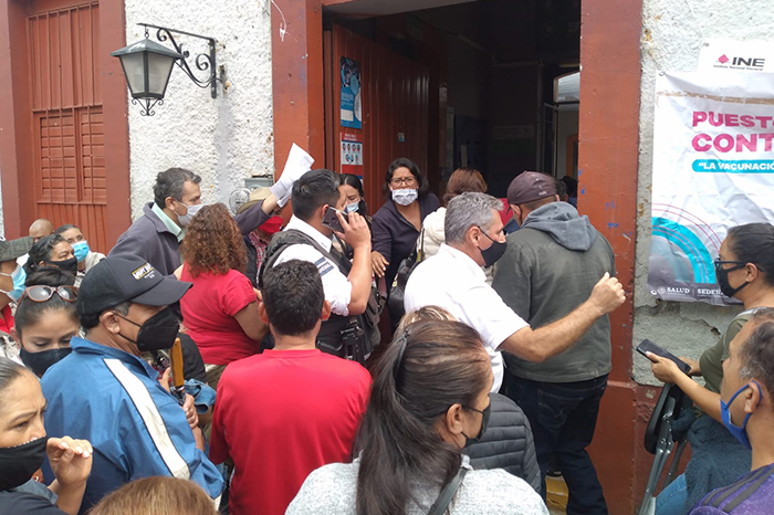 Hacia las 02:00 de la tarde la fila se detuvo. Durante casi 30 minutos que se sintieron como dos horas no se avanzó, al tiempo que el cielo se despejaba y dejaba que el sol cayera con aplomo sobre la gente cada vez más exasperada. Entonces pasó lo que tanto se temía: en la calle paralela a la principal, a un costado del templo, andaba una empleada de la Secretaría del Bienestar escoltada por dos policías informando, sólo a quien le preguntara, que ya no había vacuna.