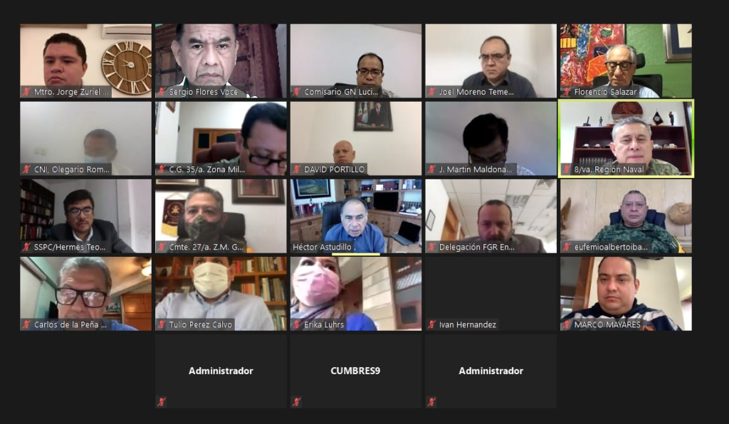 Estuvieron presentes el secretario general de Gobierno, Florencio Salazar Adame; el comandante de la Octava Región Naval, Julio César Pescina Ávila; el comandante de la Novena Región Militar, Eufemio Alberto Ibarra Flores; el coordinador Estatal de la Guardia Nacional, Lucio Vergara Gómez! el Delegado de la FGR, Fernando García Fernández y el representante del Centro Nacional de Inteligencia, Olegario Romero.