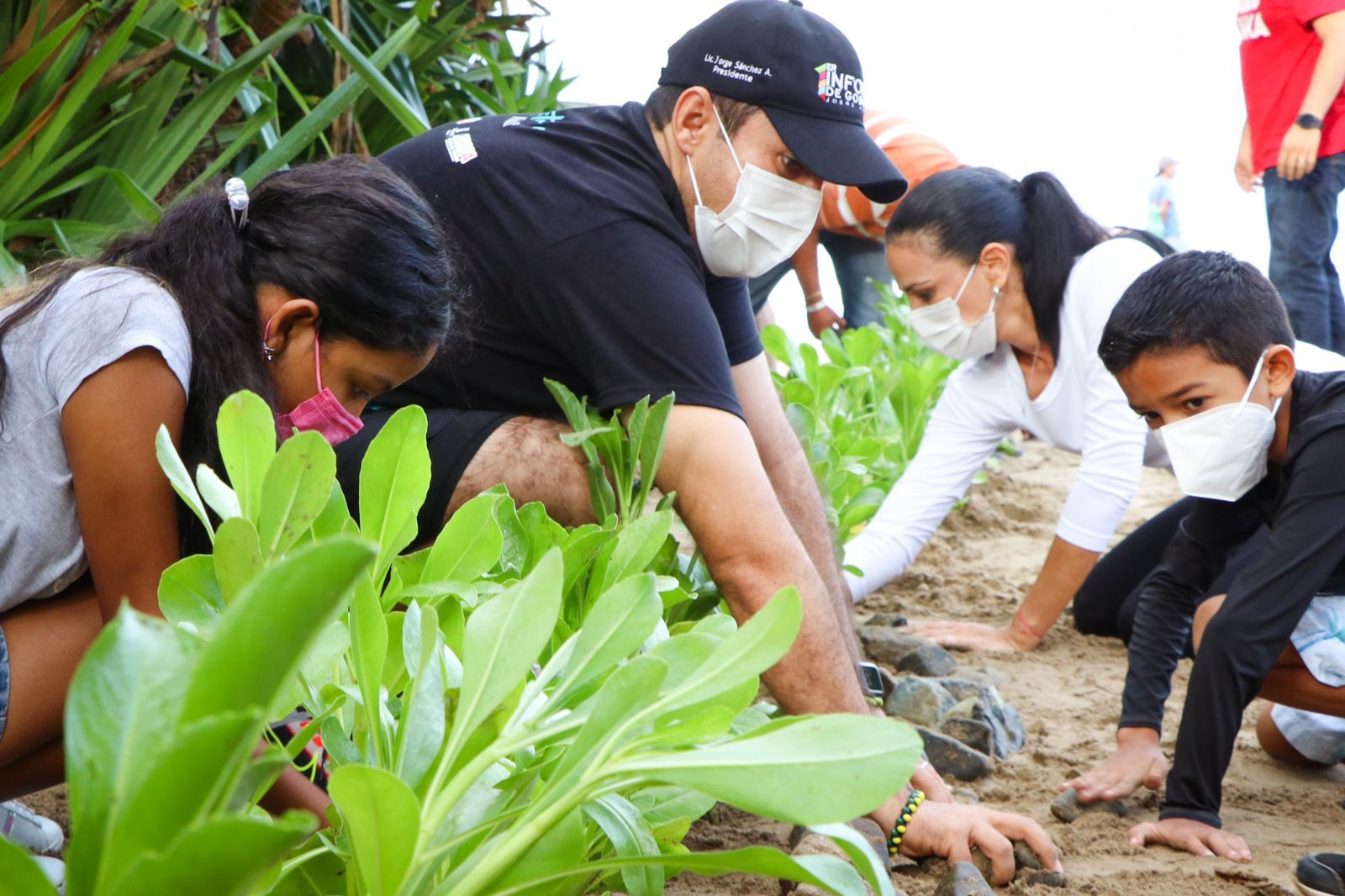 Siendo la preservación del medio ambiente un tema de alta prioridad para el gobierno de Zihuatanejo de Azueta, este domingo el presidente Jorge Sánchez Allec y su esposa Lizette Tapia Castro encabezaron los trabajos de reforestación en el campamento tortuguero que en fecha reciente se instaló en la playa de La Ropa, con la finalidad de que ese espacio ofrezca una mejor imagen a visitantes y residentes del destino turístico. En esta tarea de siembra de plantas de ornato, el Jefe de la Comuna y la presidenta honoraria del DIF Municipal fueron acompañados por un grupo de niños que con entusiasmo participaron en la realización de acción.