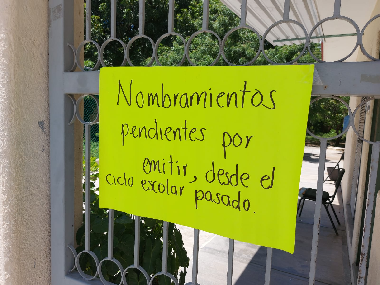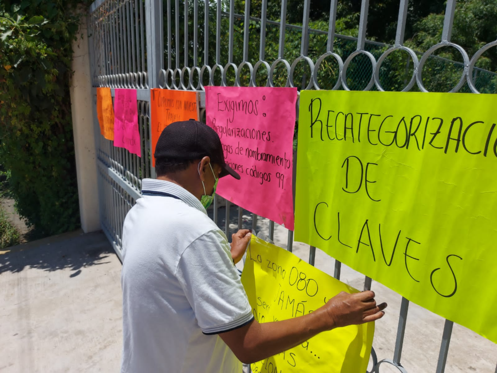 «La zona 080 unida jamás será vencida… No a las imposiciones», «nombramientos pendientes por emitir, desde el ciclo escolar pasado», «exigimos recategorizaciones», son solo algunas de las consignas que los mentores escribieron en las pancartas que pegaron en la reja principal de la sede regional de la Secretaría de Educación Guerrero (SEG).