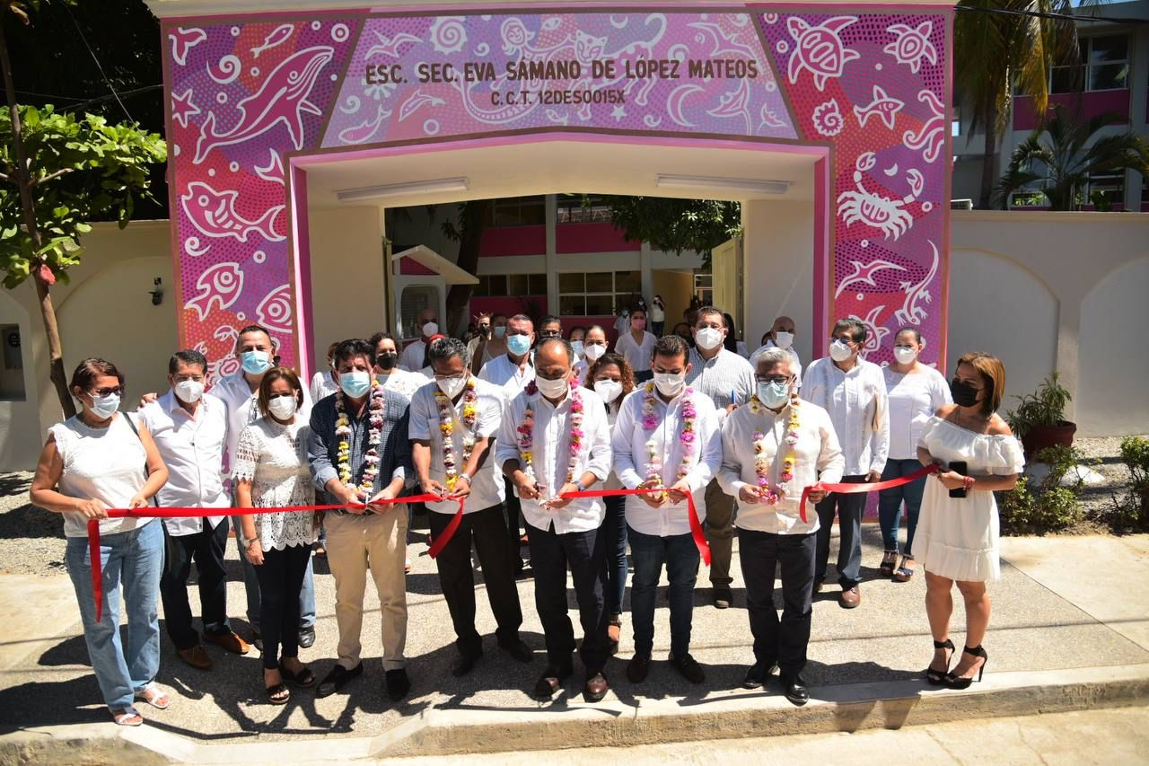Zihuatanejo, Gro., 03 de octubre de 2021.- En el segundo día de su periodo adicional de gobierno 2021-2024 y al acompañar al gobernador del estado, Héctor Astudillo Flores, en el acto inaugural de un nuevo edificio construido para la escuela secundaria general Eva Sámano de López Mateos, el presidente Jorge Sánchez Allec refrendó su compromiso con el sector educativo en el municipio al ofrecer que hará la gestión necesaria para apoyar el mejoramiento de las instalaciones de este plantel.