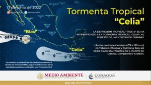 A las 10:00 horas, tiempo del centro de México, en el Océano Pacífico se desarrolló la tormenta tropical Celia, a partir de la Depresión Tropical Tres-E; se localizó aproximadamente a 235 kilómetros (km) al sur de San Salvador, República de El Salvador, y a 450 km al sureste de la desembocadura del Río Suchiate, en la frontera México-Guatemala. Tiene vientos máximos sostenidos de 65 kilómetros por hora (km/h), rachas de 85 km/h y mantiene desplazamiento al nor-noreste a 6 km/h.