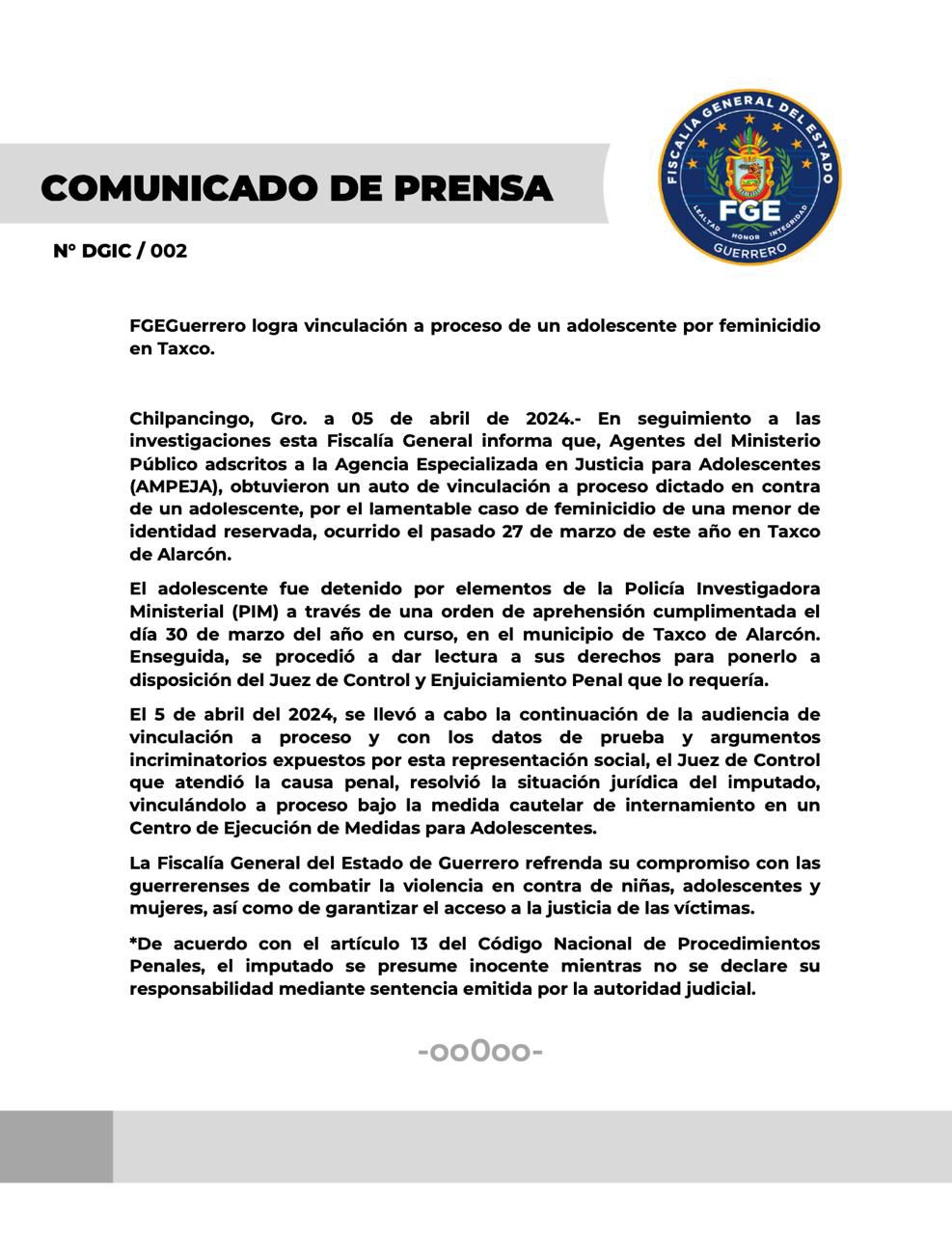 Chilpancingo, Gro. a 05 de abril de 2024.- En seguimiento a las investigaciones esta Fiscalía General informa que, Agentes del Ministerio Público adscritos a la Agencia Especializada en Justicia para Adolescentes (AMPEJA), obtuvieron un auto de vinculación a proceso dictado en contra de un adolescente, por el lamentable caso de feminicidio de una menor de identidad reservada, ocurrido el pasado 27 de marzo de este año en Taxco de Alarcón.