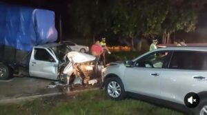El percance ocurrió alrededor de las 9:00 de la noche, cuando una camioneta de carga impactó de frente contra una SUV color plata, provocando daños materiales considerables en ambos vehículos y obstruyendo parcialmente la circulación en ambos sentidos.